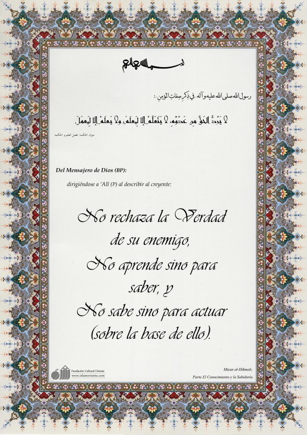 Del Mensajero de Dios (BP): dirigiéndose a ‘Alî (P) al describir al creyente: No rechaza la Verdad de su enemigo, no aprende sino para saber, y no sabe sino para actuar (sobre la base de ello).[I]
