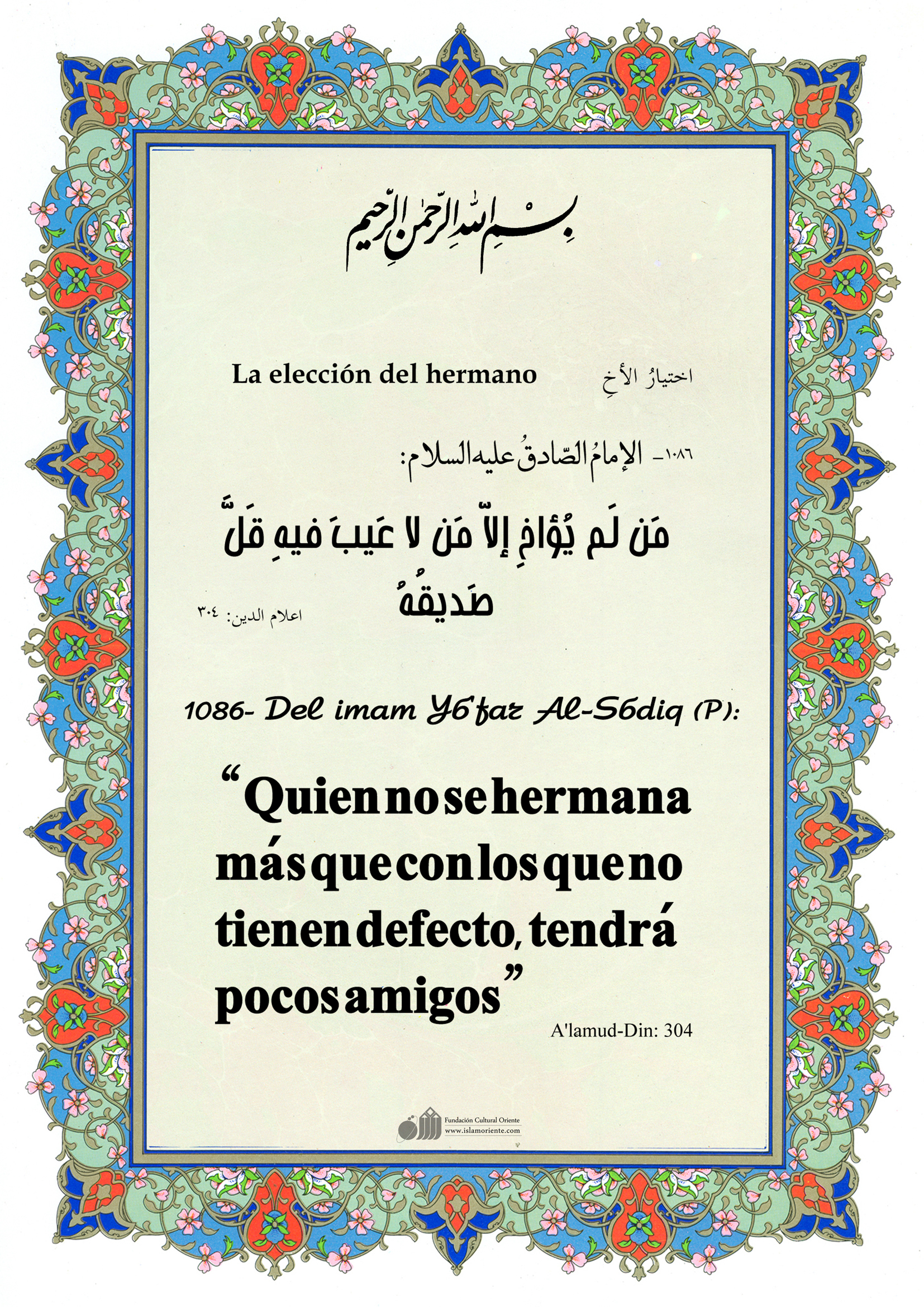 Del imam Yá'far Al-Sádiq (P): “Quien no se hermana más que con los que no tienen defecto, tendrá pocos amigos”