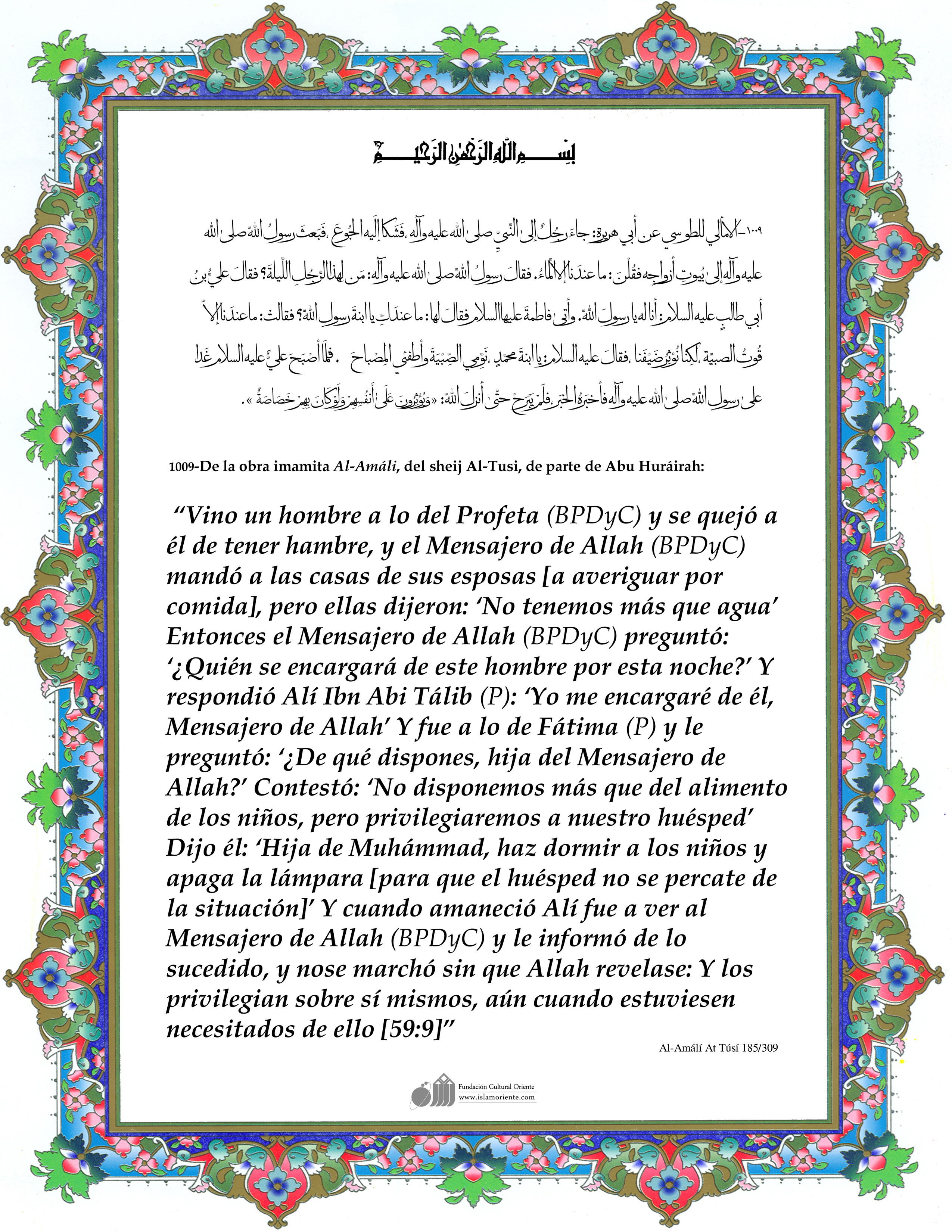 De la obra imamita Al-Amáli, del sheij Al-Tusi, de parte de Abu Huráirah: “Vino un hombre a lo del Profeta (BPDyC) y se quejó a él de tener hambre, y el Mensajero de Allah (BPDyC) mandó a las casas de sus esposas [a averiguar por comida], pero ellas dijeron: ‘No tenemos más que agua’ Entonces el Mensajero de Allah (BPDyC) preguntó: ‘¿Quién se encargará de este hombre por esta noche?’ Y respondió Alí Ibn Abi Tálib (P): ‘Yo me encargaré de él, Mensajero de Allah’ Y fue a lo de Fátima (P) y le preguntó: ‘¿De qué dispones, hija del Mensajero de Allah?’ Contestó: ‘No disponemos más que del alimento de los niños, pero privilegiaremos a nuestro huésped’ Dijo él: ‘Hija de Muhámmad, haz dormir a los niños y apaga la lámpara [para que el huésped no se percate de la situación]’ Y cuando amaneció Alí fue a ver al Mensajero de Allah (BPDyC) y le informó de lo sucedido, y nose marchó sin que Allah revelase: Y los privilegian sobre sí mismos, aún cuando estuviesen necesitados de ello [59:9]”