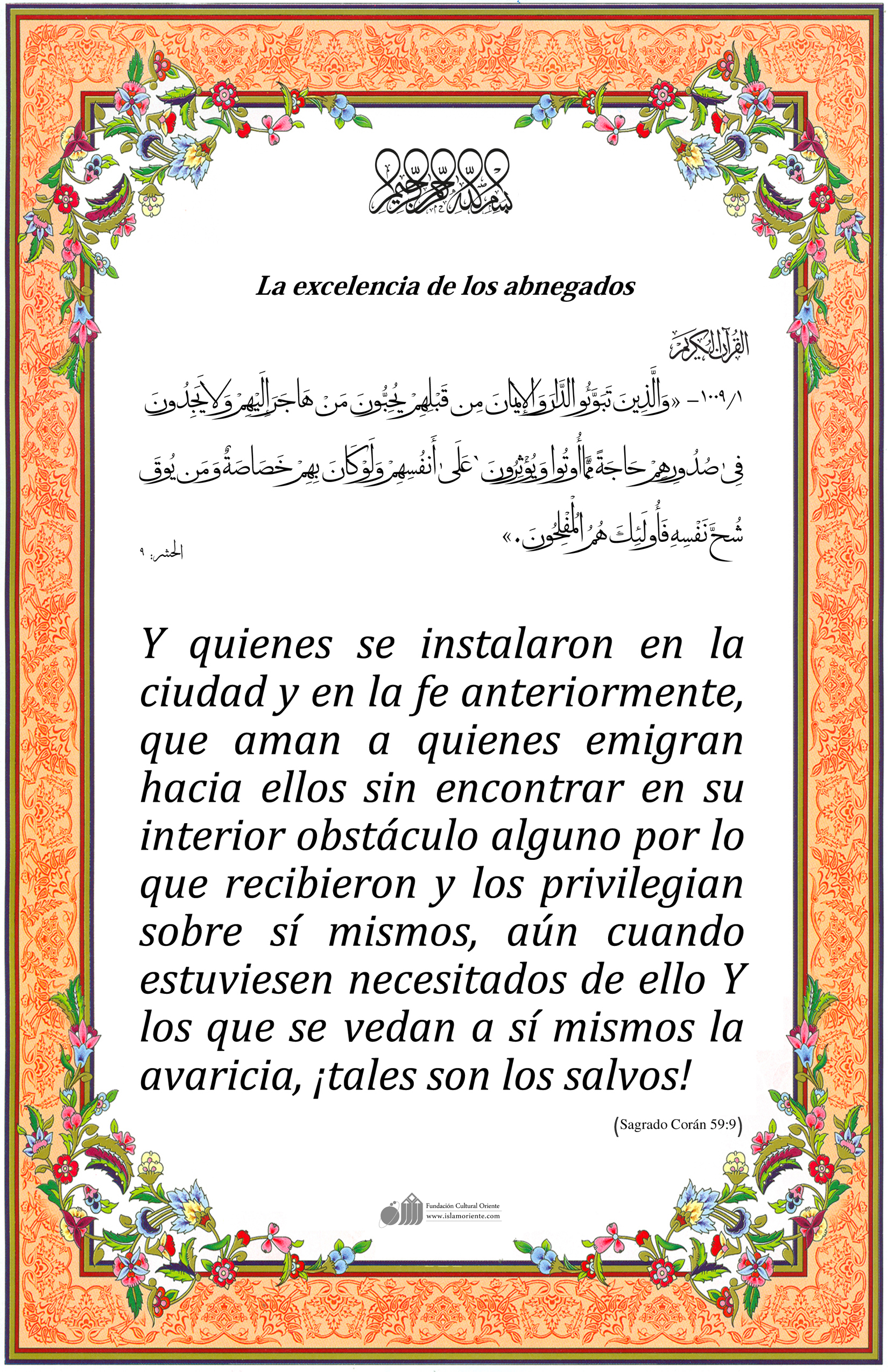 Y quienes se instalaron en la ciudad y en la fe anteriormente, que aman a quienes emigran hacia ellos sin encontrar en su interior obstáculo alguno por lo que recibieron y los privilegian sobre sí mismos, aún cuando estuviesen necesitados de ello Y los que sevedan a sí mismos la avaricia, ¡tales son los salvos!