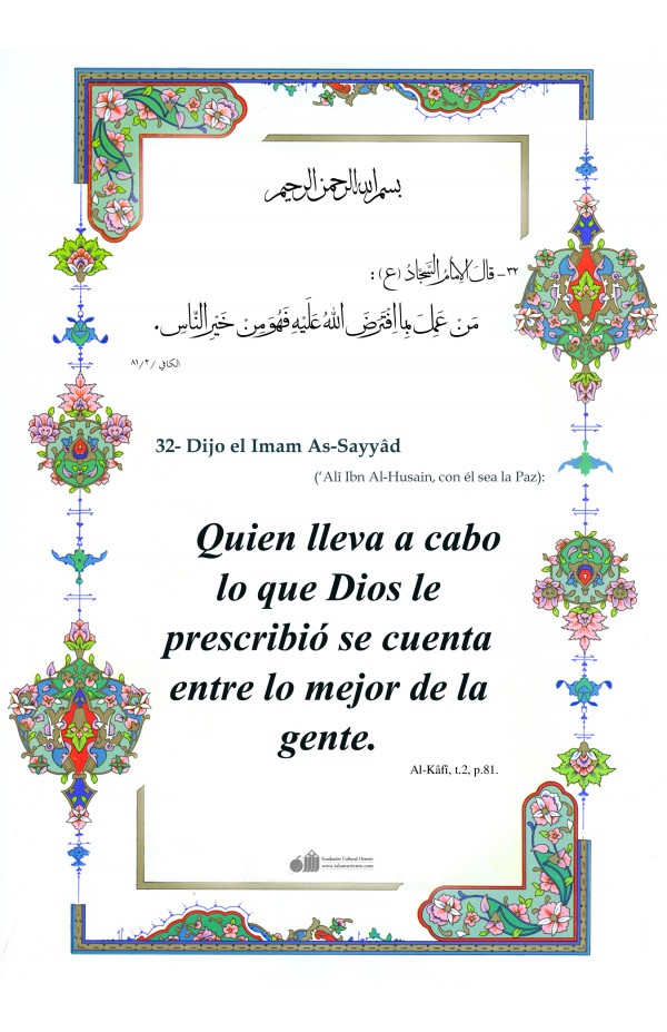 Dijo el Imam As-Sayyâd (‘Alî Ibn Al-Husain, con él sea la Paz): Quien lleva a cabo lo que Dios le prescribió se cuenta entre lo mejor de la gente.