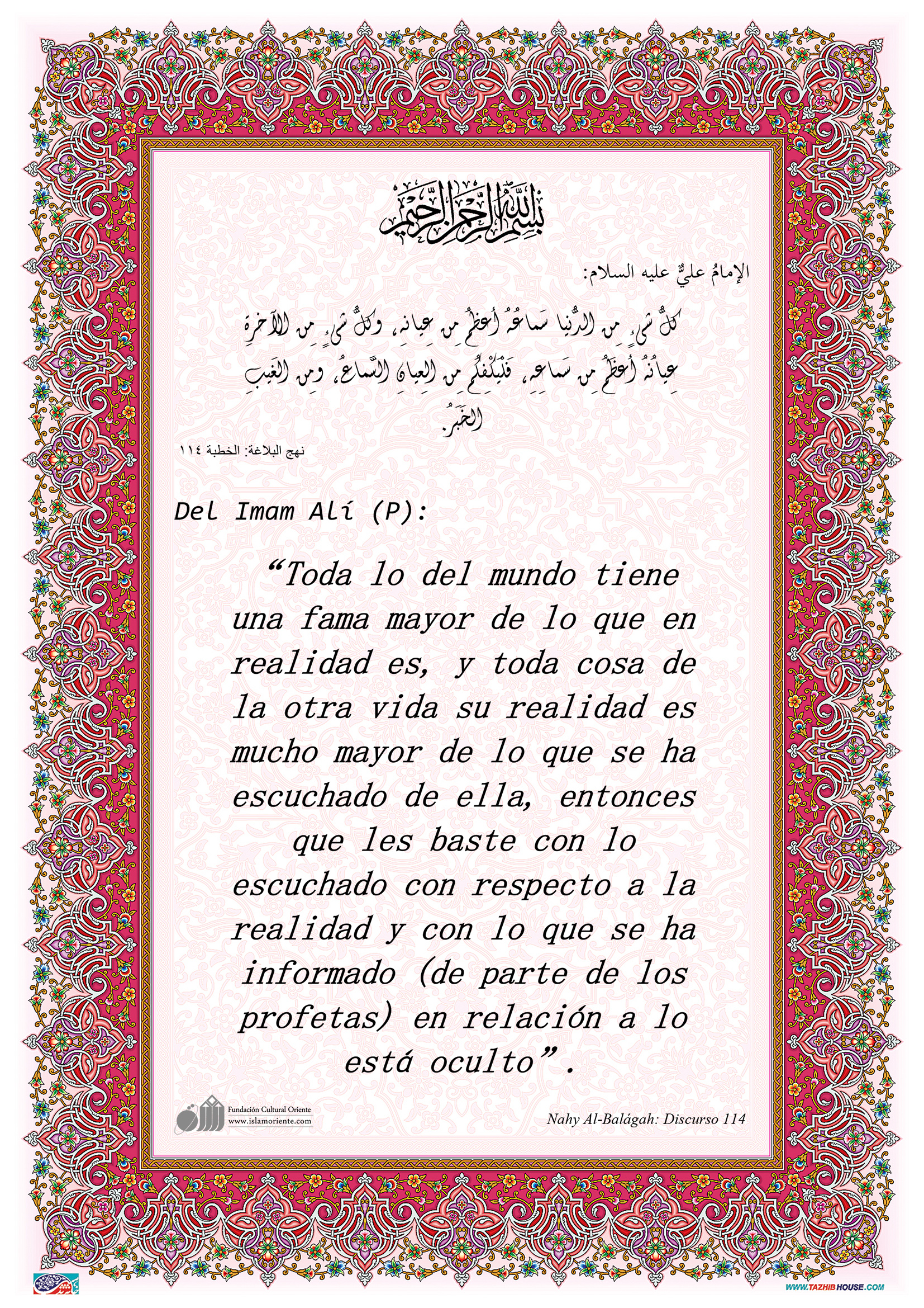 Del Imam Alí (P): “Toda lo del mundo tiene una fama mayor de lo que en realidad es, y toda cosa de la otra vida su realidad es mucho mayor de lo que se ha escuchado de ella, entonces que les baste con lo escuchado con respecto a la realidad y con lo que se ha informado (de parte de los profetas) en relación a lo está oculto”.