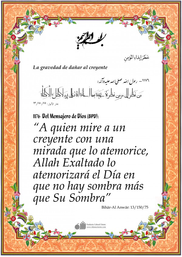 Del Mensajero de Dios (BPD): “A quien mire a un creyente con una mirada que lo atemorice, Allah Exaltado lo atemorizará el Día en que no hay sombra más que Su Sombra”