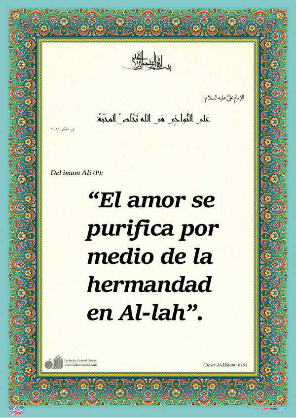 Del imam Alí (P): “El amor se purifica por medio de la hermandad en Al-lah”.