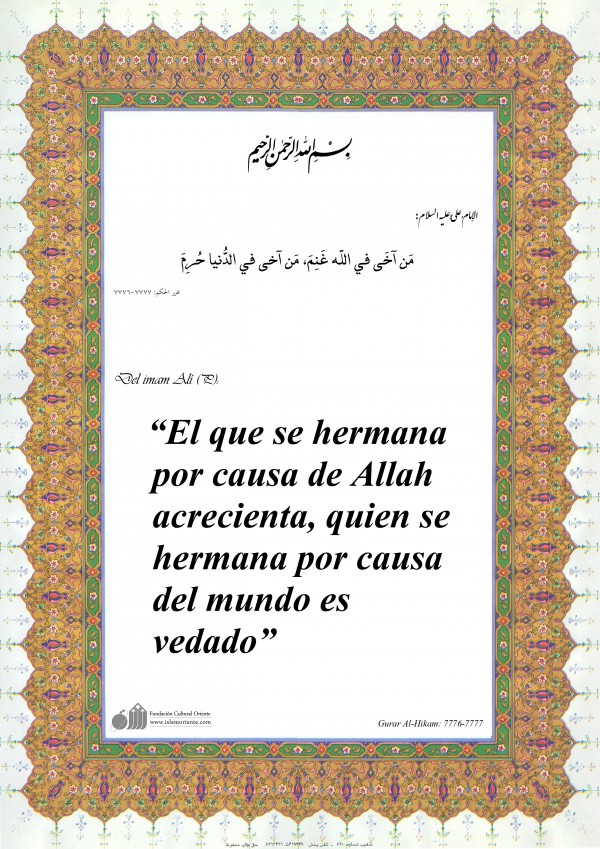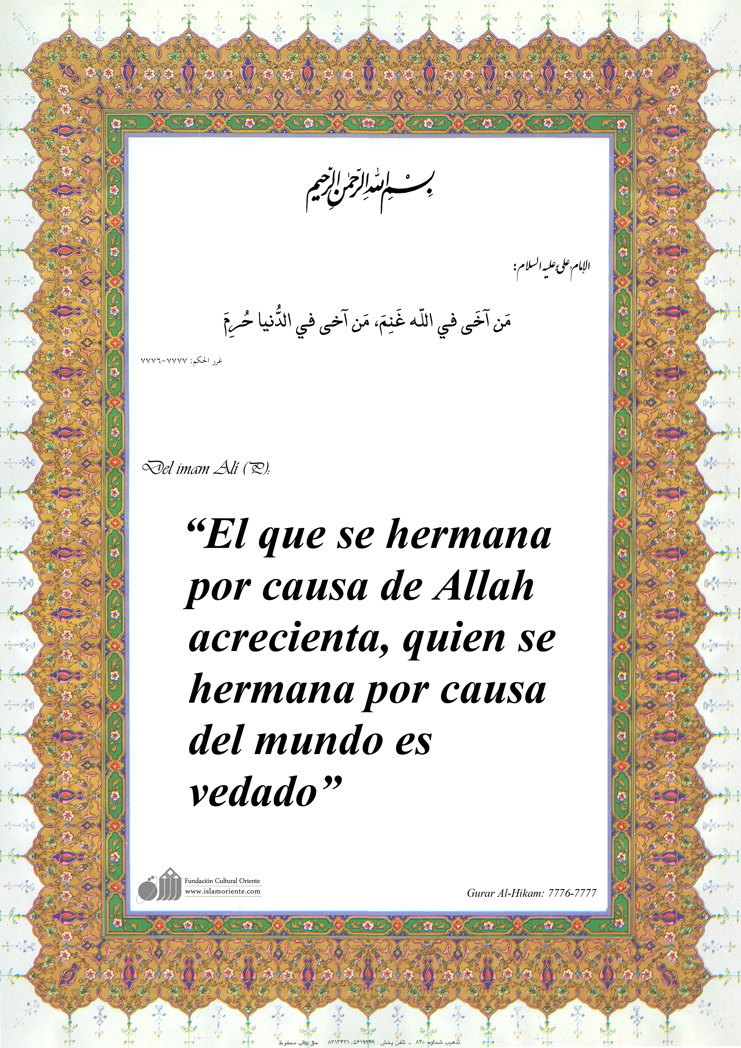 Del imam Alí (P): “El que se hermana por causa de Allah acrecienta, quien se hermana por causa del mundo es vedado”.