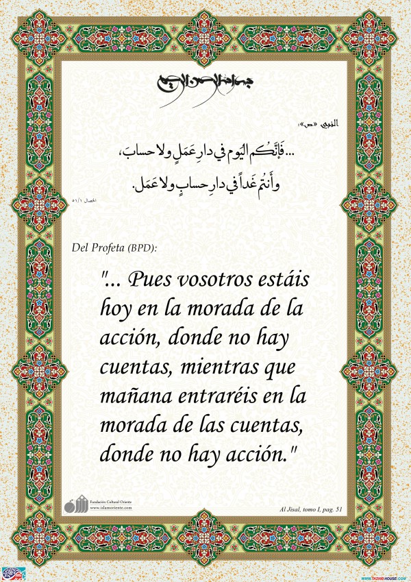 النبي «ص»: ... فَإنَّكُم اليَوم في دارِ عَمَلٍ ولا حسابَ، وأَنتُم غَداً في دارِ حسابٍ ولا عَمَل.