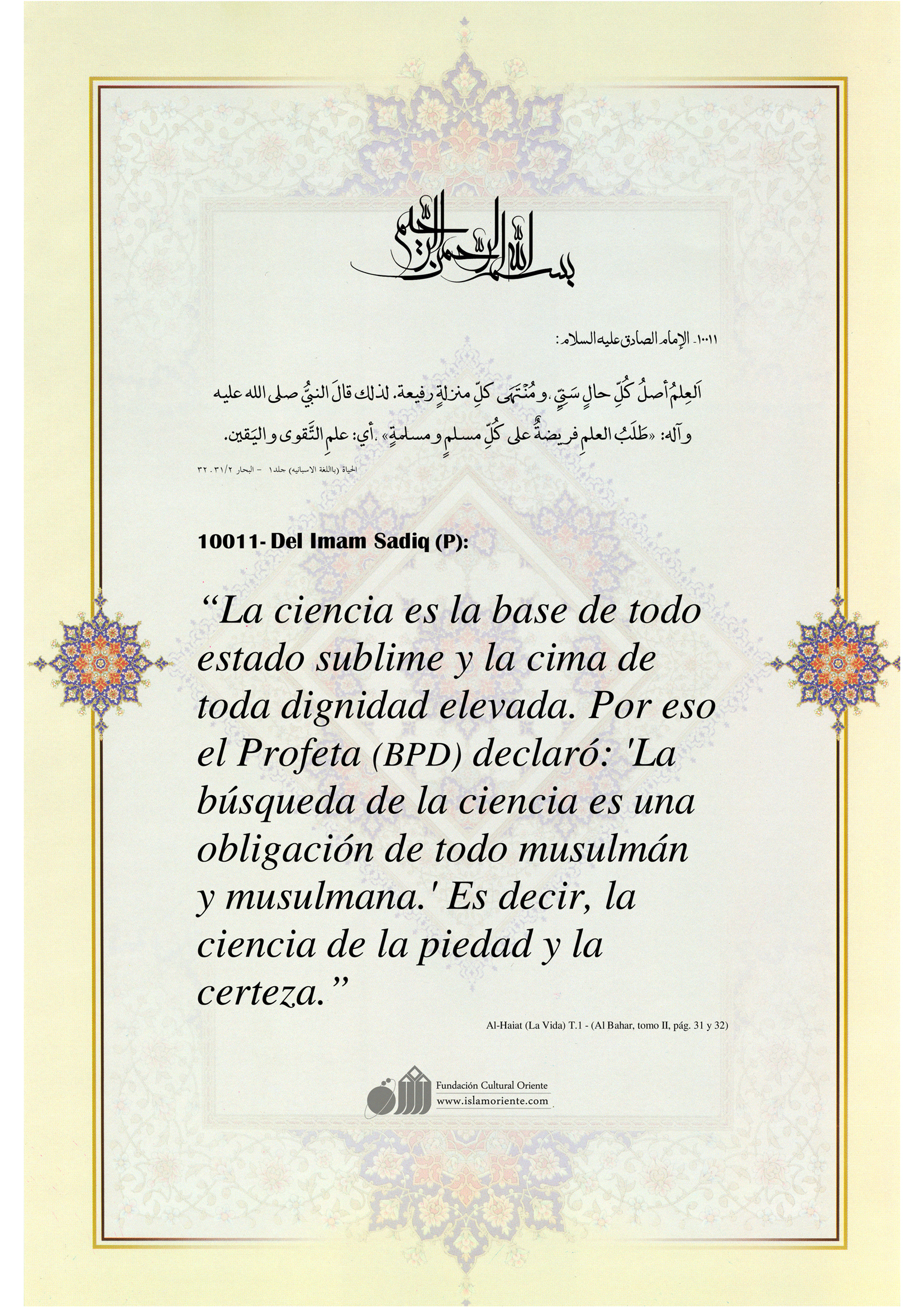 Del Imam Sadiq (P): “La ciencia es la base de todo estado sublime y la cima de toda dignidad elevada. Por eso el Profeta (BPD) declaró: 'La búsqueda de la ciencia es una obligación de todo musulmán y musulmana.' Es decir, la ciencia de la piedad y la certeza.”