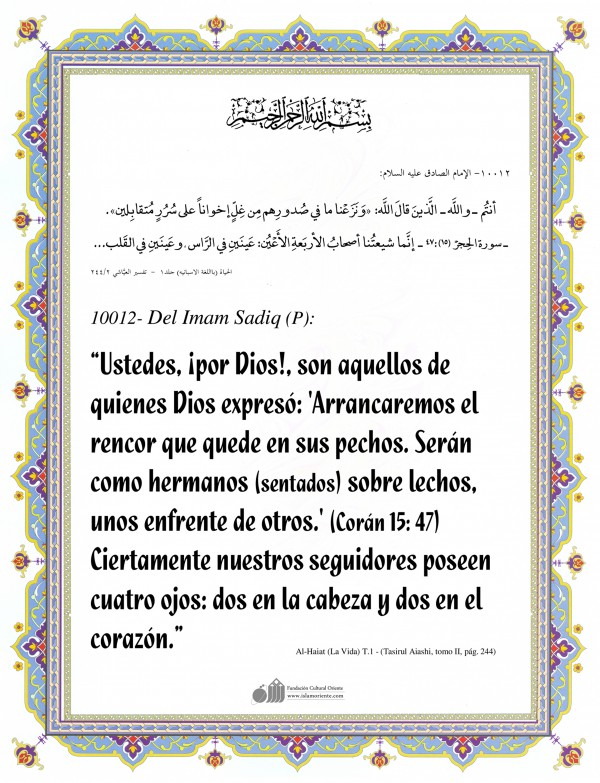 Del Imam Sadiq (P): “Ustedes, ¡por Dios!, son aquellos de quienes Dios expresó: 'Arrancaremos el rencor que quede en sus pechos. Serán como hermanos (sentados) sobre lechos, unos enfrente de otros.' (Corán 15: 47) Ciertamente nuestros seguidores poseen cuatro ojos: dos en la cabeza y dos en el corazón.”