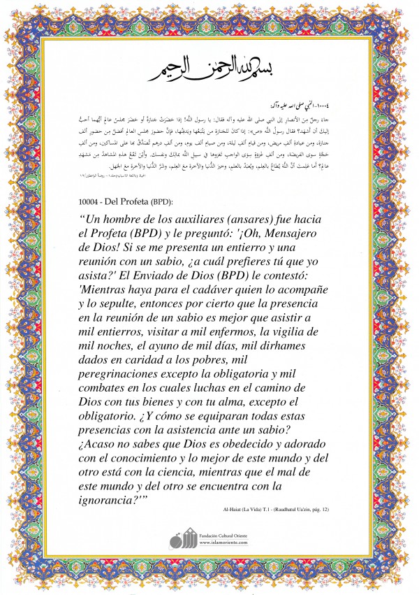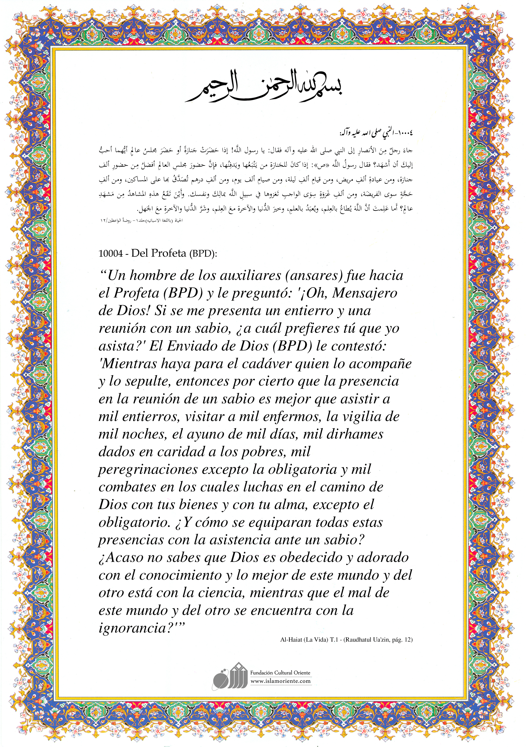 Del Profeta (BPD): “Un hombre de los auxiliares (ansares) fue hacia el Profeta (BPD) y le preguntó: '¡Oh, Mensajero de Dios! Si se me presenta un entierro y una reunión con un sabio, ¿a cuál prefieres tú que yo asista?' El Enviado de Dios (BPD) le contestó: 'Mientras haya para el cadáver quien lo acompañe y lo sepulte, entonces por cierto que la presencia en la reunión de un sabio es mejor que asistir a mil entierros, visitar a mil enfermos, la vigilia de mil noches, el ayuno de mil días, mil dirhames dados en caridad a los pobres, mil peregrinaciones excepto la obligatoria y mil combates en los cuales luchas en el camino de Dios con tus bienes y con tu alma, excepto el obligatorio. ¿Y cómo se equiparan todas estas presencias con la asistencia ante un sabio? ¿Acaso no sabes que Dios es obedecido y adorado con el conocimiento y lo mejor de este mundo y del otro está con la ciencia, mientras que el mal de este mundo y del otro se encuentra con la ignorancia?'”