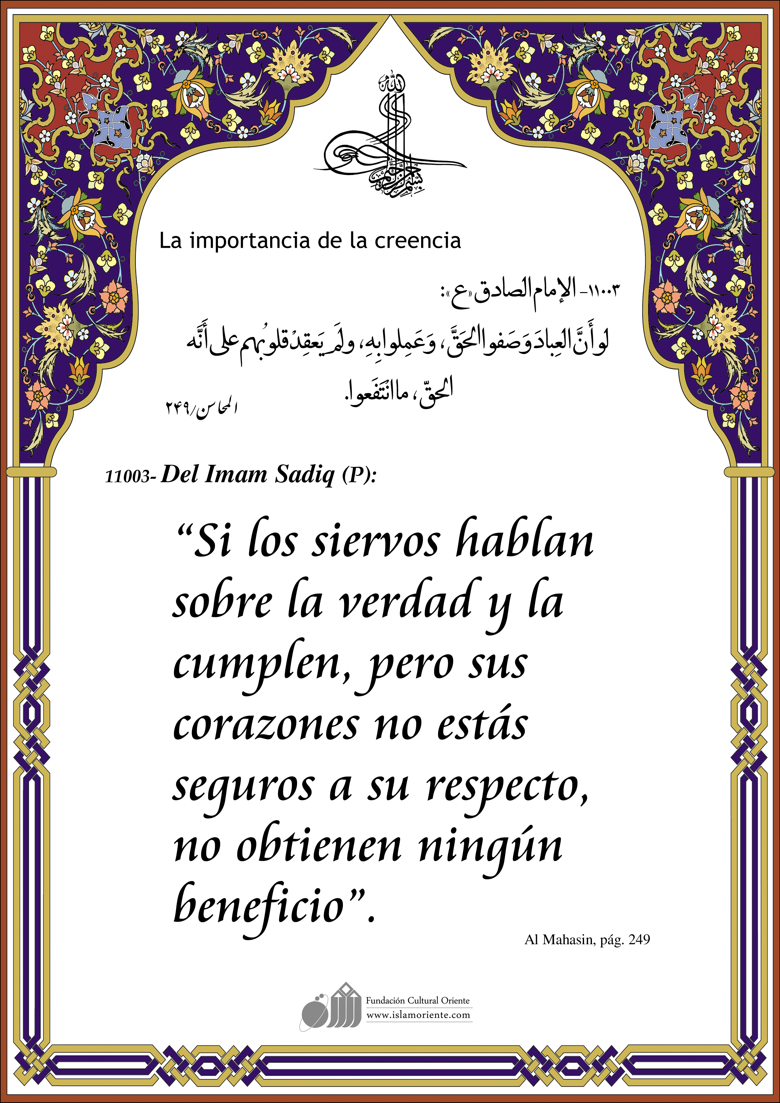 Del Imam Sadiq (P): “Si los siervos hablan sobre la verdad y la cumplen, pero sus corazones no estás seguros a su respecto, no obtienen ningún beneficio”.