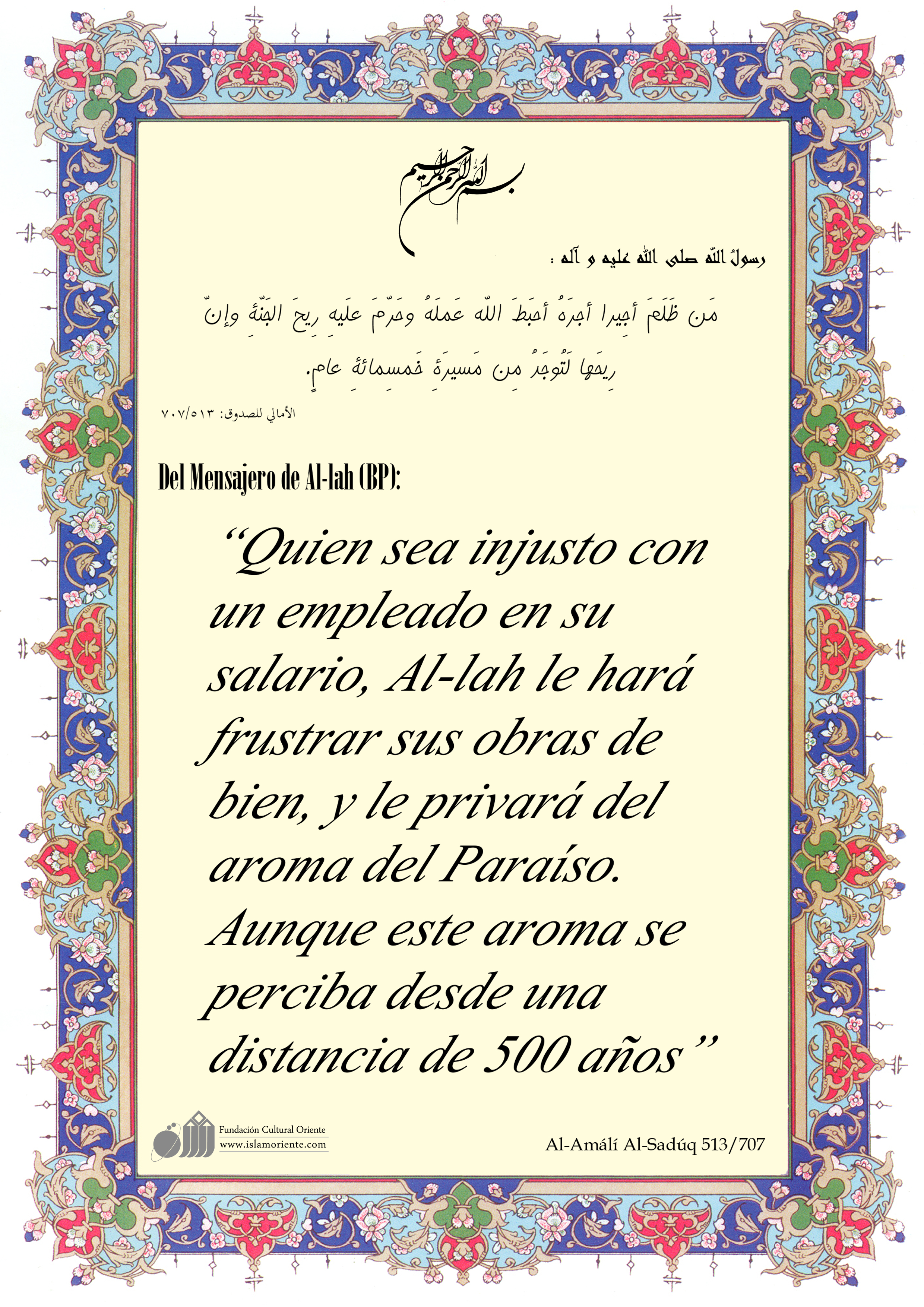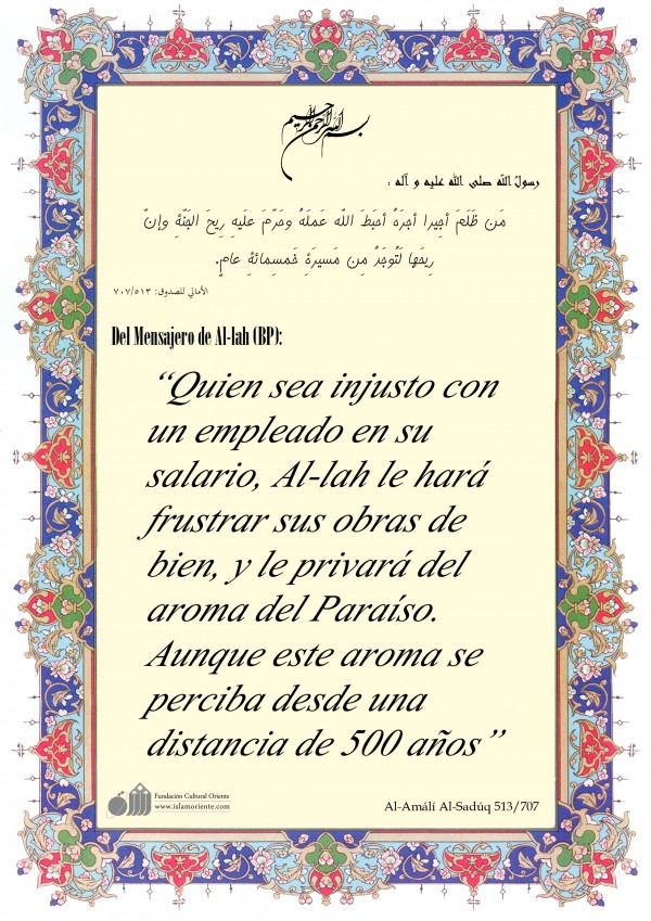 Del Mensajero de Al-lah (BP): “Quien sea injusto con un empleado en su salario, Al-lah le hará frustrar sus obras de bien, y le privará del aroma del Paraíso. Aunque este aroma se perciba desde una distancia de 500 años”
