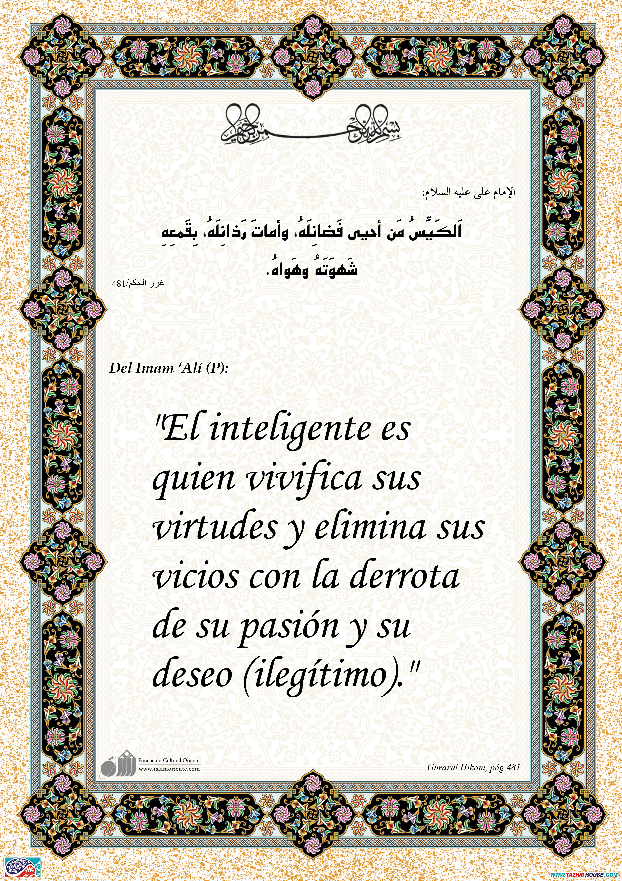 Del Imam ‘Alí (P): "El inteligente es quien vivifica sus virtudes y elimina sus vicios con la derrota de su pasión y su deseo (ilegítimo)."
