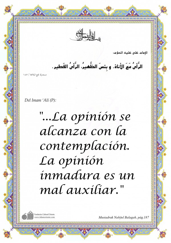 Del Imam ‘Alí (P): "...La opinión se alcanza con la contemplación. La opinión inmadura es un mal auxiliar."