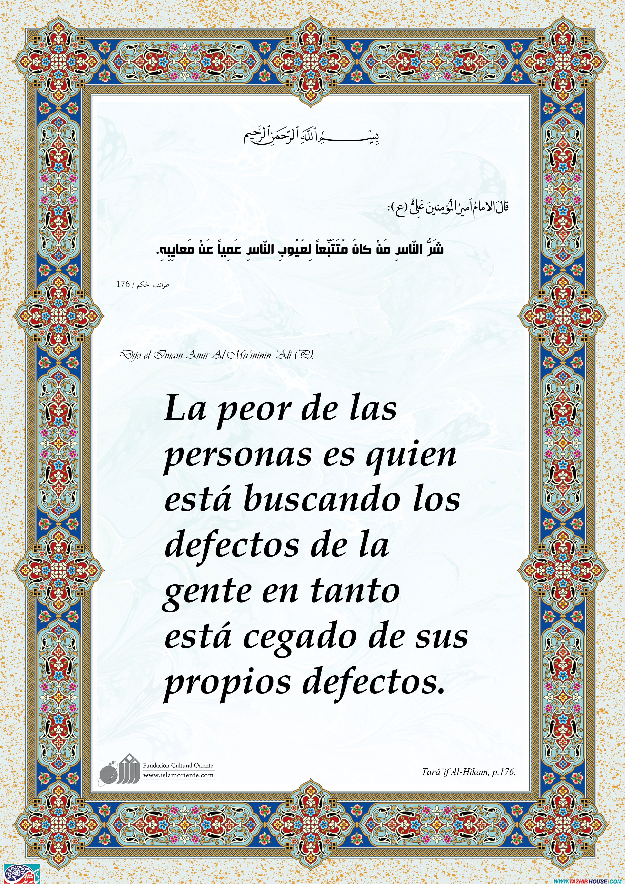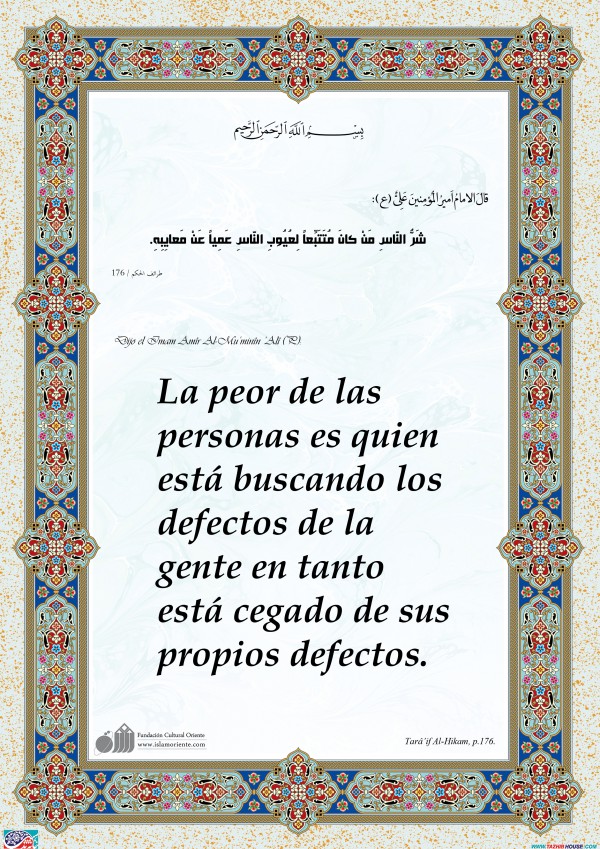 Dijo el Imam Amîr Al-Mu’minîn ‘Alî (P): La peor de las personas es quien está buscando los defectos de la gente en tanto está cegado de sus propios defectos.