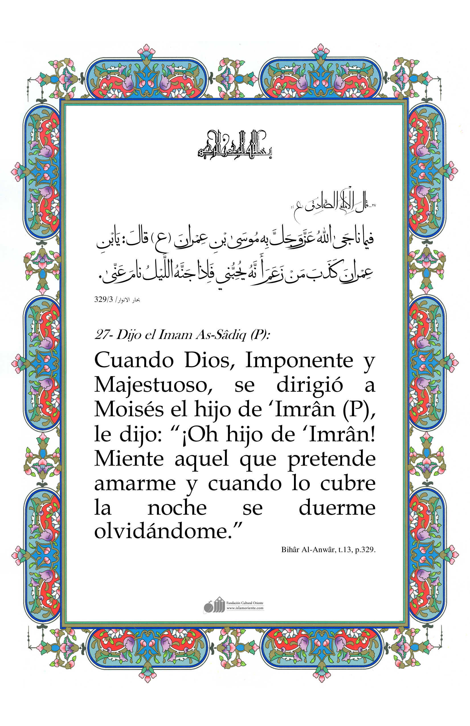 Dijo el Imam As-Sâdiq (P): Cuando Dios, Imponente y Majestuoso, se dirigió a Moisés el hijo de ‘Imrân (P), le dijo: “¡Oh hijo de ‘Imrân! Miente aquel que pretende amarme y cuando lo cubre la noche se duerme olvidándome.”