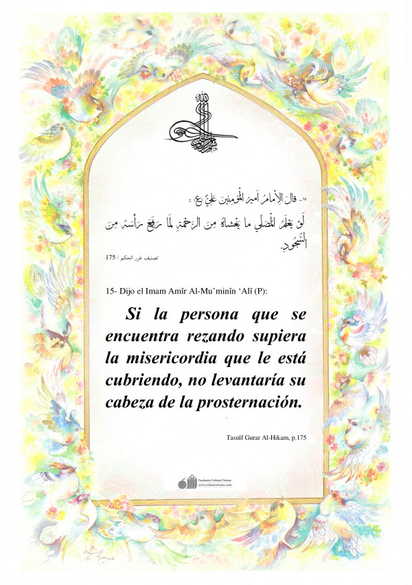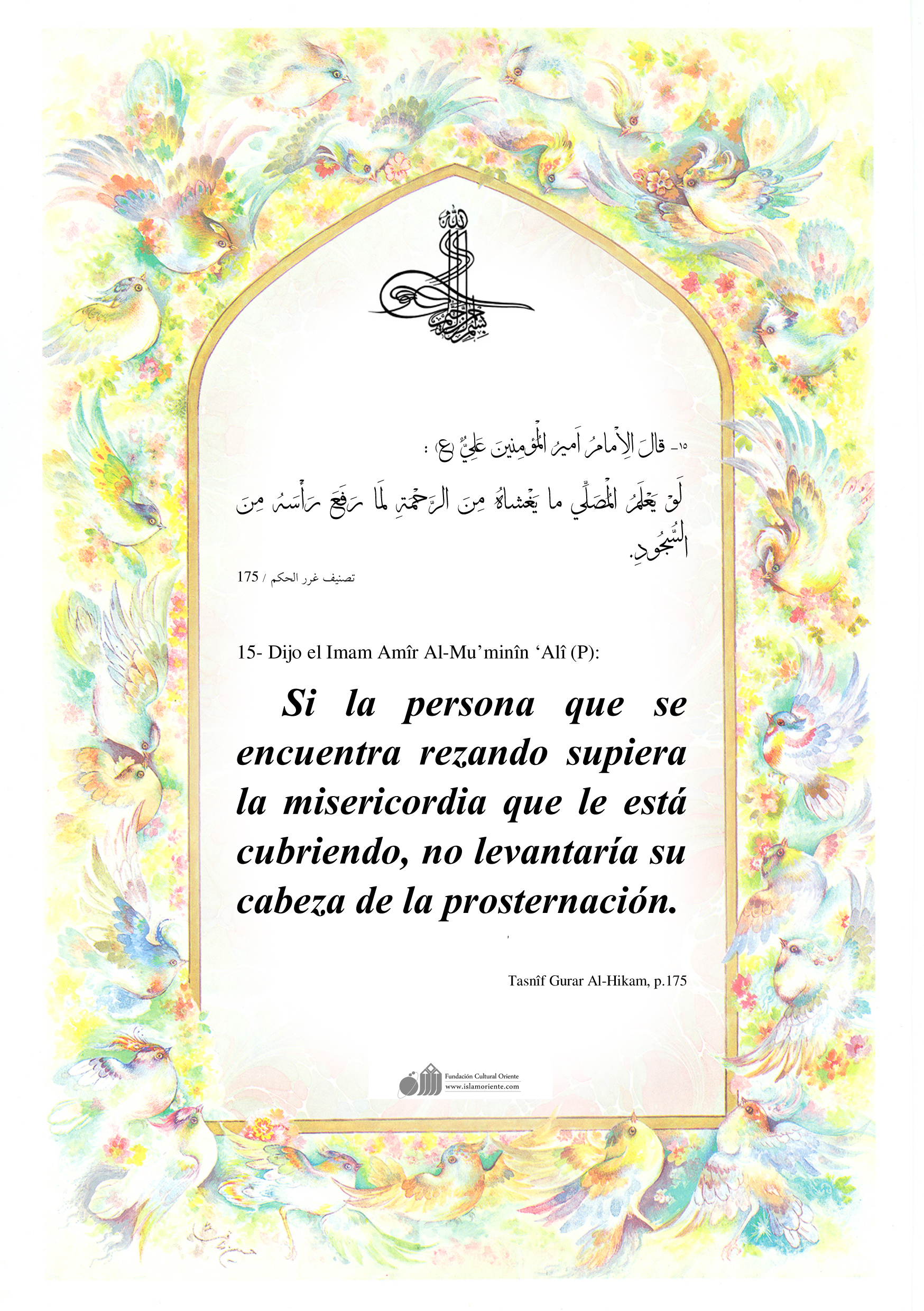 Dijo el Imam Amîr Al-Mu’minîn ‘Alî (P): Si la persona que se encuentra rezando supiera la misericordia que le está cubriendo, no levantaría su cabeza de la prosternación.