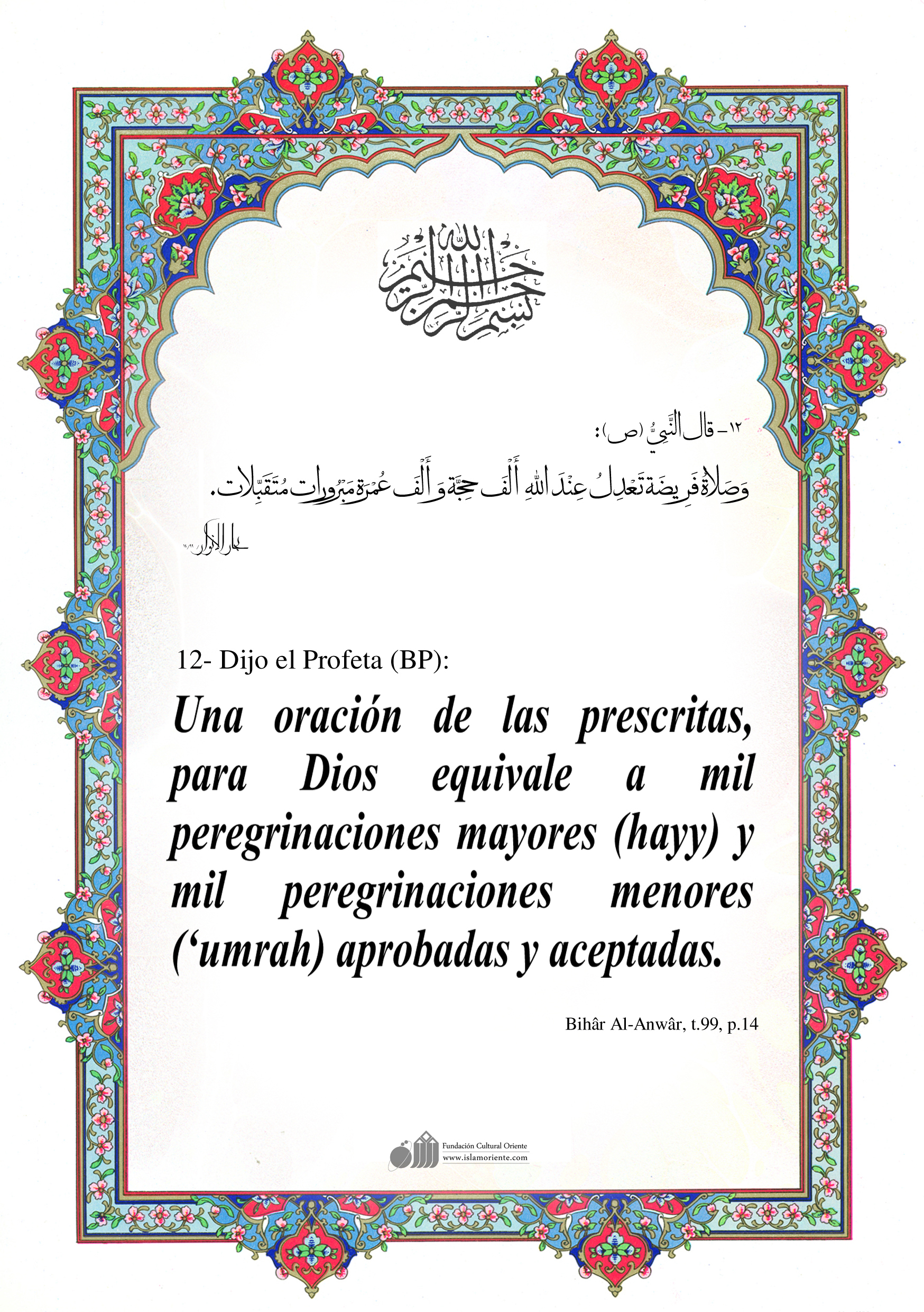 Dijo el Profeta (BP): Una oración de las prescritas, para Dios equivale a mil peregrinaciones mayores (hayy) y mil peregrinaciones menores (‘umrah) aprobadas y aceptadas.
