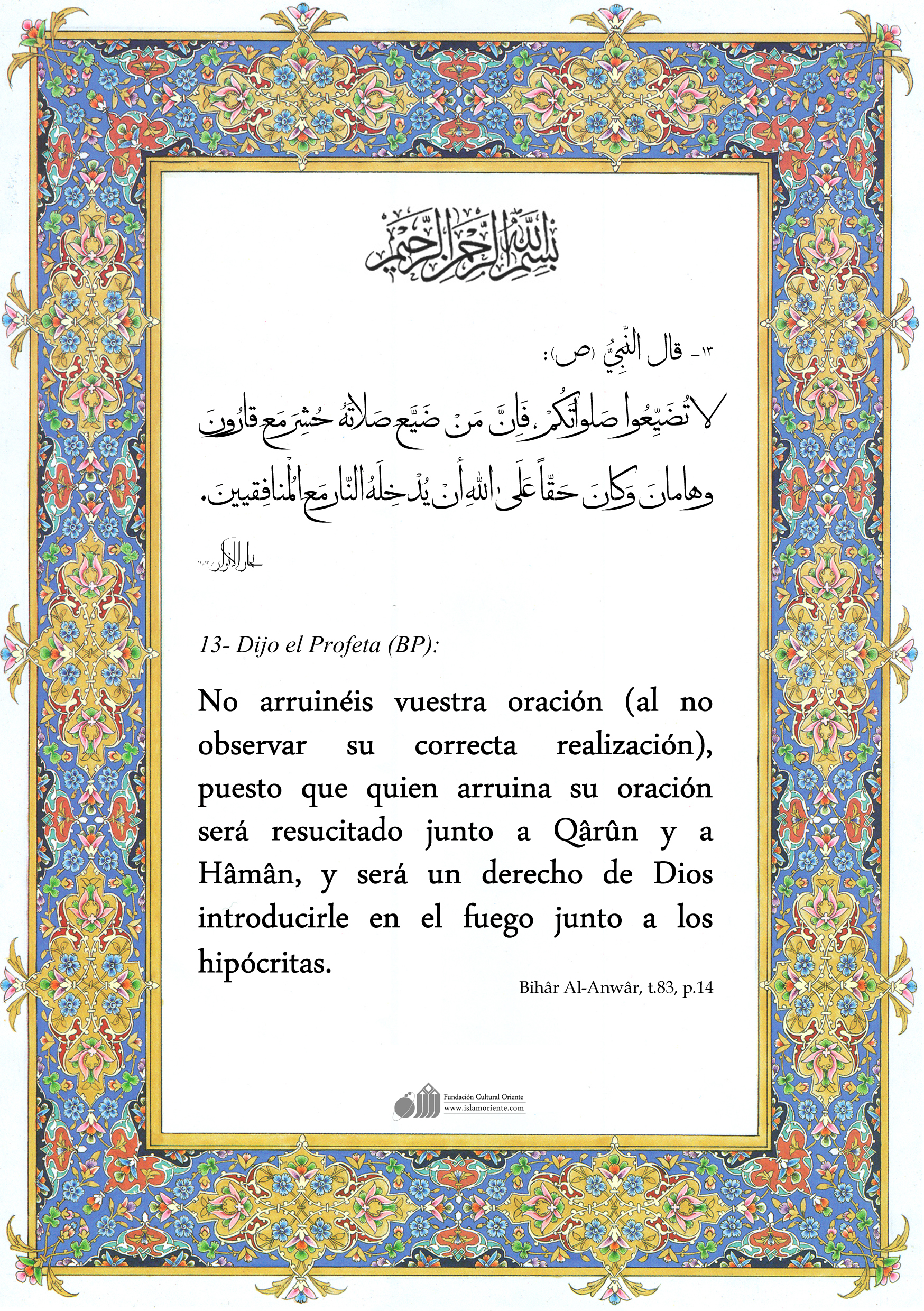 Dijo el Profeta (BP): No arruinéis vuestra oración (al no observar su correcta realización), puesto que quien arruina su oración será resucitado junto a Qârûn y a Hâmân, y será un derecho de Dios introducirle en el fuego junto a los hipócritas.