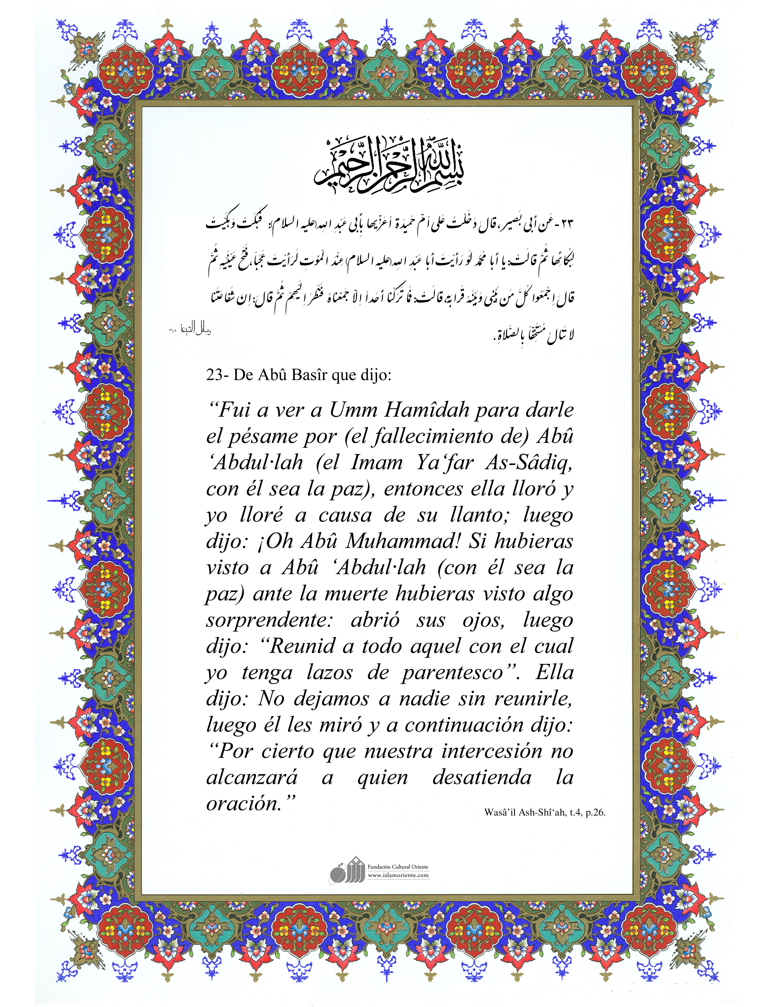 De Abû Basîr que dijo: “Fui a ver a Umm Hamîdah para darle el pésame por (el fallecimiento de) Abû ‘Abdul·lah (el Imam Ya‘far As-Sâdiq, con él sea la paz), entonces ella lloró y yo lloré a causa de su llanto; luego dijo: ¡Oh Abû Muhammad! Si hubieras visto a Abû ‘Abdul·lah (con él sea la paz) ante la muerte hubieras visto algo sorprendente: abrió sus ojos, luego dijo: “Reunid a todo aquel con el cual yo tenga lazos de parentesco”. Ella dijo: No dejamos a nadie sin reunirle, luego él les miró y a continuación dijo: “Por cierto que nuestra intercesión no alcanzará a quien desatienda la oración.”