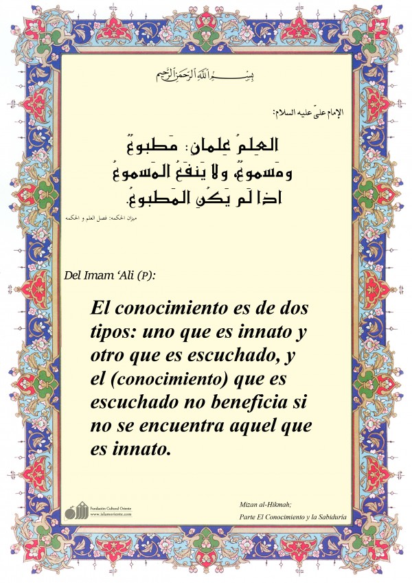 Del Imam ‘Ali (P): El conocimiento es de dos tipos: uno que es innato y otro que es escuchado, y el (conocimiento) que es escuchado no beneficia si no se encuentra aquel que es innato.[I]