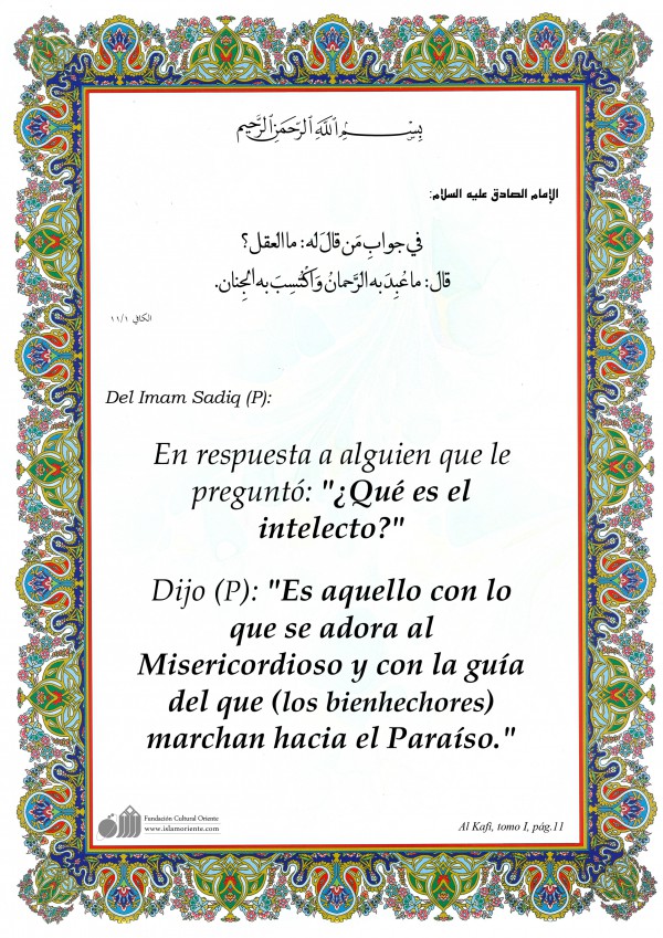Del Imam Sadiq (P): - en respuesta a alguien que le preguntó: "¿Qué es el intelecto?" dijo (P): - "Es aquello con lo que se adora al Misericordioso y con la guía del que (los bienhechores) marchan hacia el Paraíso."