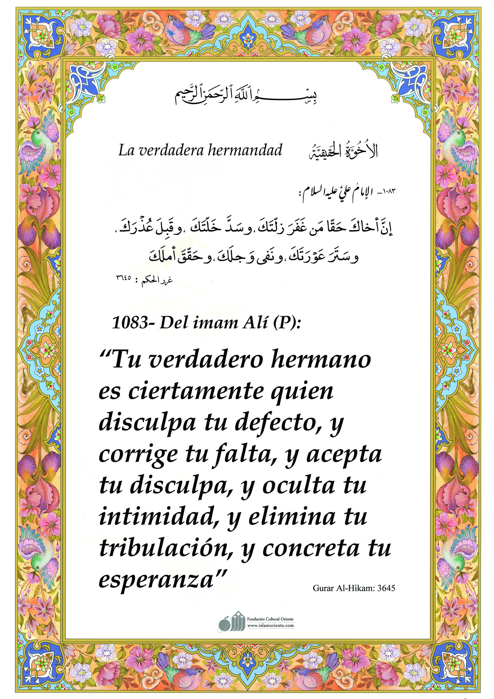 Del imam Alí (P): “Tu verdadero hermano es ciertamente quien disculpa tu defecto, y corrige tu falta, y acepta tu disculpa, y oculta tu intimidad, y elimina tu tribulación, y concreta tu esperanza”