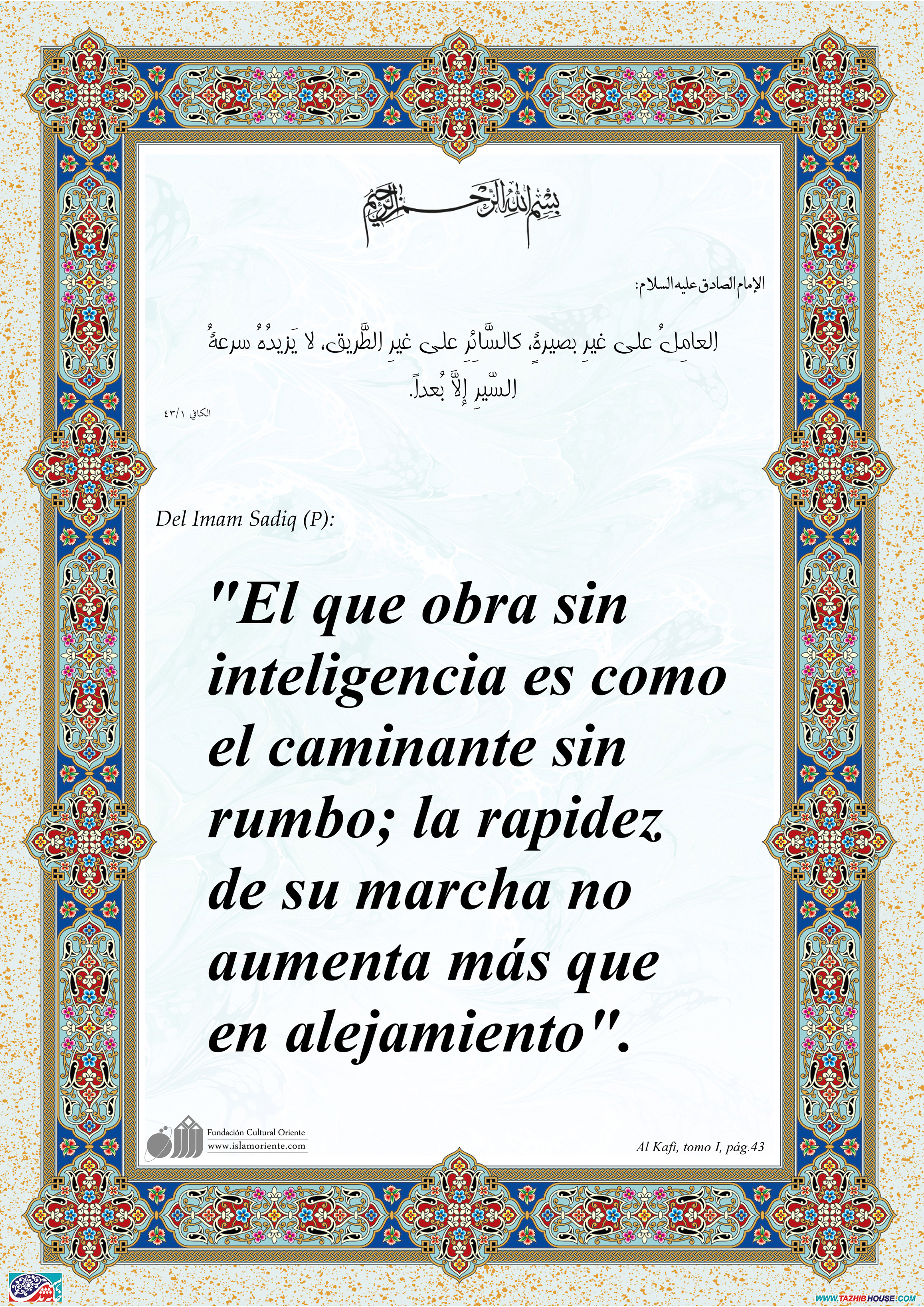 Del Imam Sadiq (P): "El que obra sin inteligencia es como el caminante sin rumbo; la rapidez de su marcha no aumenta más que en alejamiento".