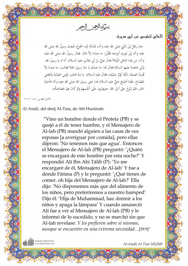 Al-Amáli, del sheij Al-Tusi, de Abi Huráirah: “Vino un hombre donde el Profeta (PB) y se quejó a él de tener hambre, y el Mensajero de Al-lah (PB) mandó alguien a las casas de sus esposas [a averiguar por comida], pero ellas dijeron: ‘No tenemos más que agua’. Entonces el Mensajero de Al-lah (PB) preguntó: ‘¿Quién se encargará de este hombre por esta noche?’ Y respondió Alí Ibn Abi Tálib (P): ‘Yo me encargaré de él, Mensajero de Al-lah’ Y fue a donde Fátima (P) y le preguntó: ‘¿Qué tienes de comer, oh hija del Mensajero de Al-lah?’ Ella dijo: ‘No disponemos más que del alimento de los niños, pero preferiremos a nuestro huésped’ Dijo él: ‘Hija de Muhammad, haz dormir a los niños y apaga la lámpara’ Y cuando amaneció Alí fue a ver al Mensajero de Al-lah (PB) y le informó de lo sucedido, y no se marchó sin que Al-lah revelase: Y les prefieren sobre sí mismos, aunque se encuentre en una extrema necesidad… [59:9]”