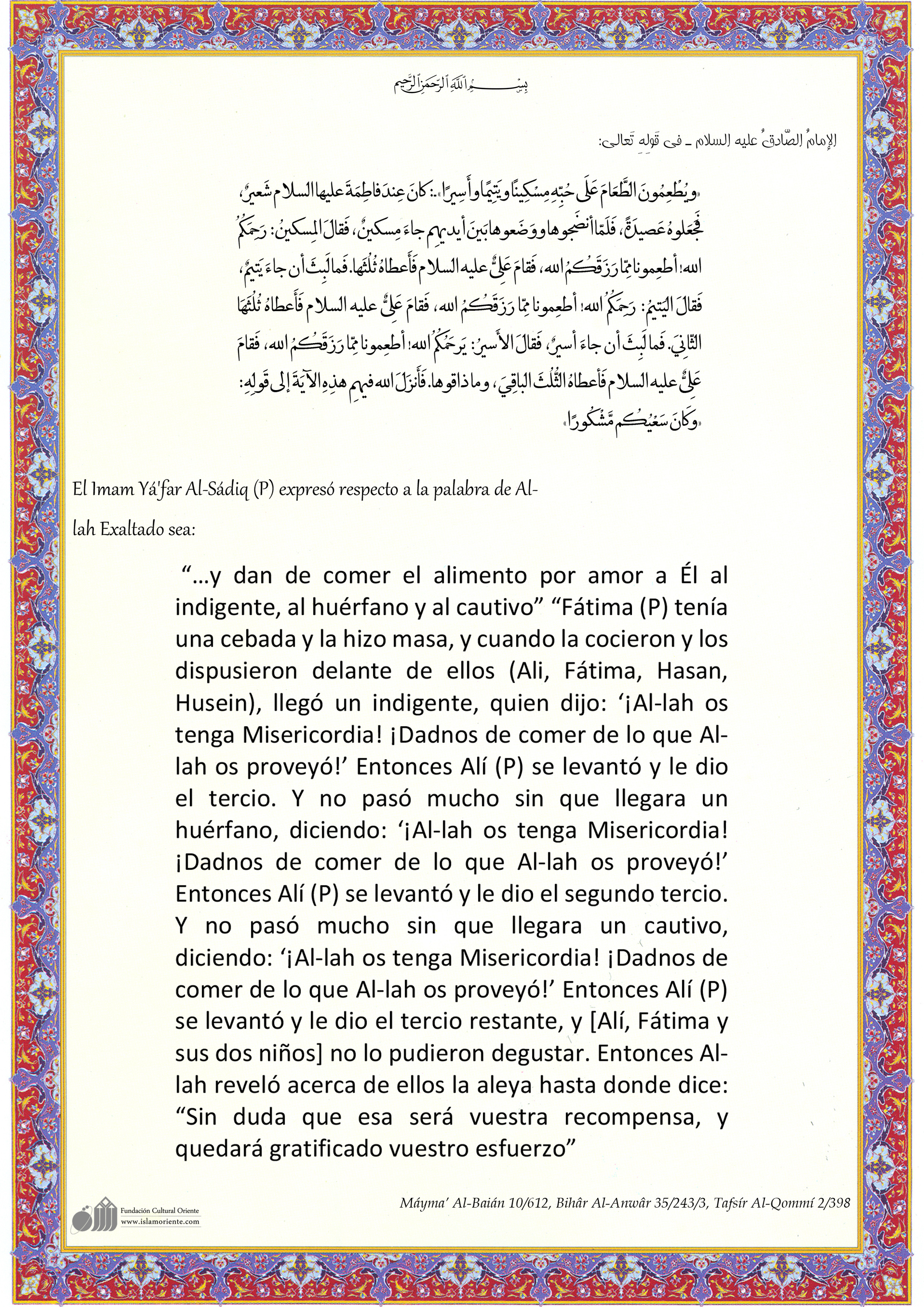 El Imam Yá'far Al-Sádiq (P) expresó respecto a la palabra de Al-lah Exaltado sea: “…y dan de comer el alimento por amor a Él al indigente, al huérfano y al cautivo” “Fátima (P) tenía una cebada y la hizo masa, y cuando la cocieron y los dispusieron delante de ellos (Ali, Fátima, Hasan, Husein), llegó un indigente, quien dijo: ‘¡Al-lah os tenga Misericordia! ¡Dadnos de comer de lo que Al-lah os proveyó!’ Entonces Alí (P) se levantó y le dio el tercio. Y no pasó mucho sin que llegara un huérfano, diciendo: ‘¡Al-lah os tenga Misericordia! ¡Dadnos de comer de lo que Al-lah os proveyó!’ Entonces Alí (P) se levantó y le dio el segundo tercio. Y no pasó mucho sin que llegara un cautivo, diciendo: ‘¡Al-lah os tenga Misericordia! ¡Dadnos de comer de lo que Al-lah os proveyó!’ Entonces Alí (P) se levantó y le dio el tercio restante, y [Alí, Fátima y sus dos niños] no lo pudieron degustar. Entonces Al-lah reveló acerca de ellos la aleya hasta donde dice: “Sin duda que esa será vuestra recompensa, y quedará gratificado vuestro esfuerzo”