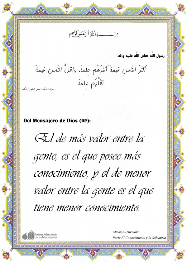 Del Mensajero de Dios (BP): El de más valor entre la gente, es el que posee más conocimiento, y el de menor valor entre la gente es el que tiene menor conocimiento.[I]