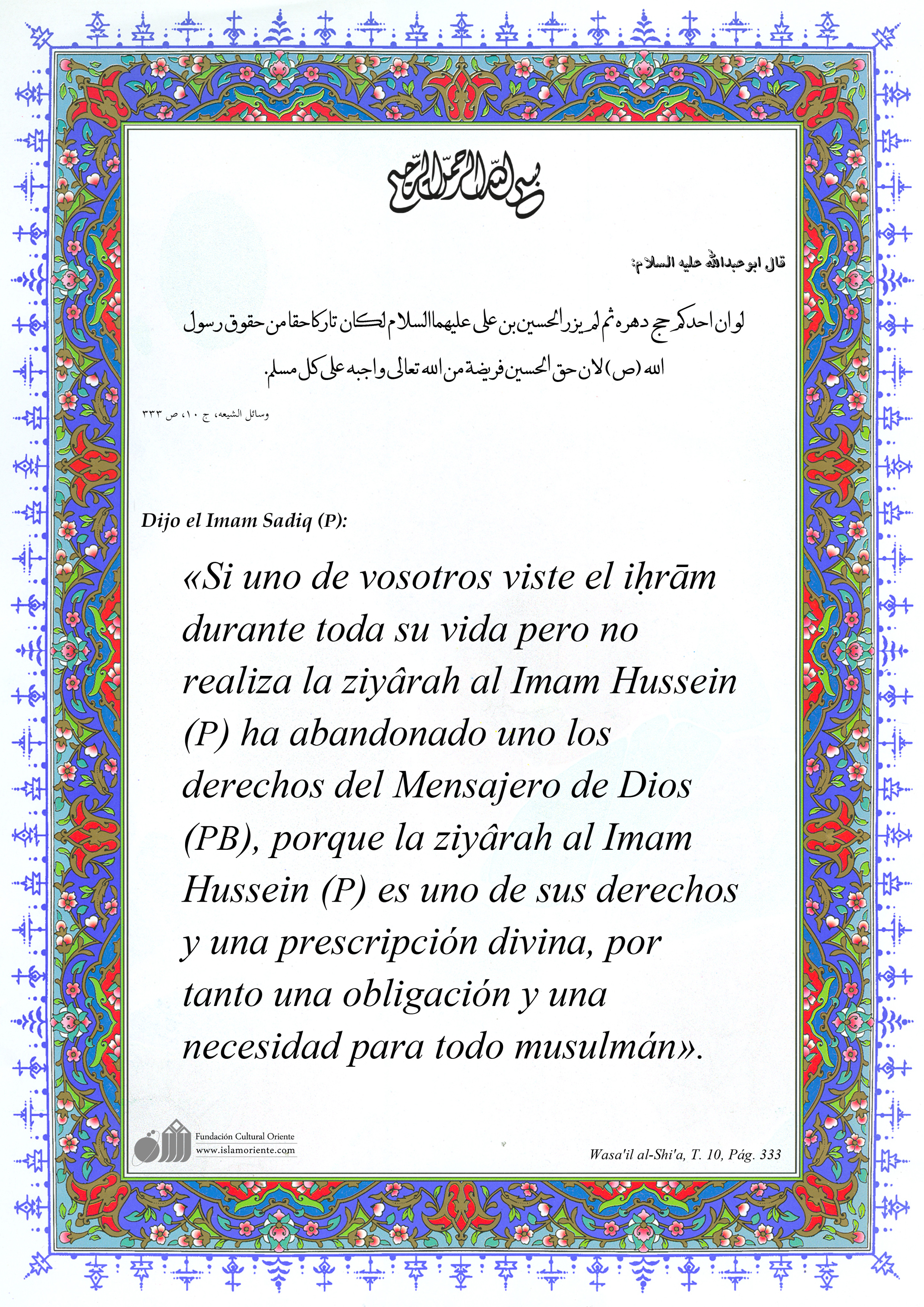 Dijo el Imam Sadiq (P): «Si uno de vosotros viste el iḥrām[1] durante toda su vida[2] pero no realiza la ziyârah al Imam Hussein (P) ha abandonado uno los derechos del Mensajero de Dios (PB), porque la ziyârah al Imam Hussein (P) es uno de sus derechos y una prescripción divina, por tanto una obligación y una necesidad para todo musulmán».