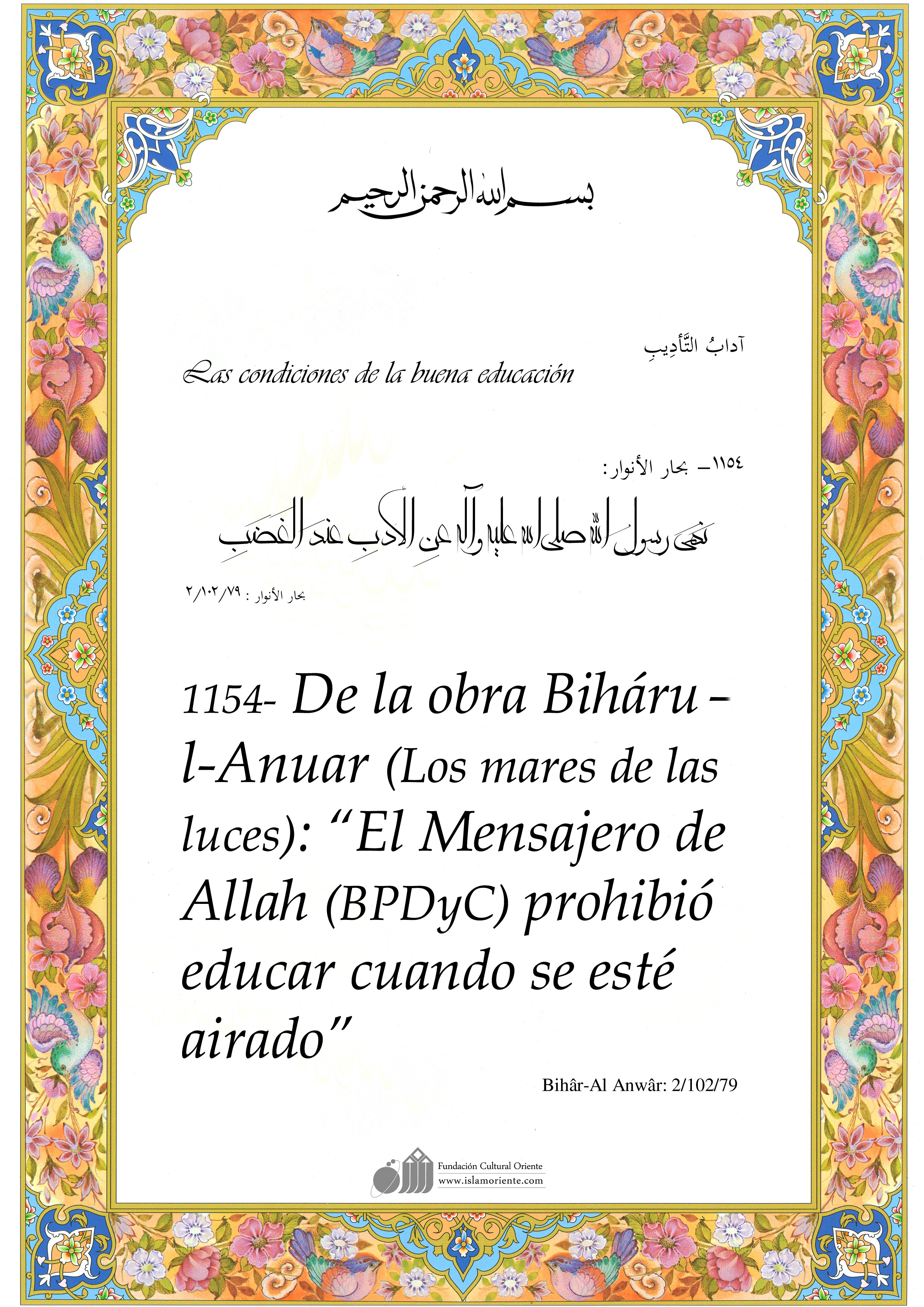 De la obra Biháru –l-Anuar (Los mares de las luces): “El Mensajero de Allah (BPDyC) prohibió educar cuando se esté airado”