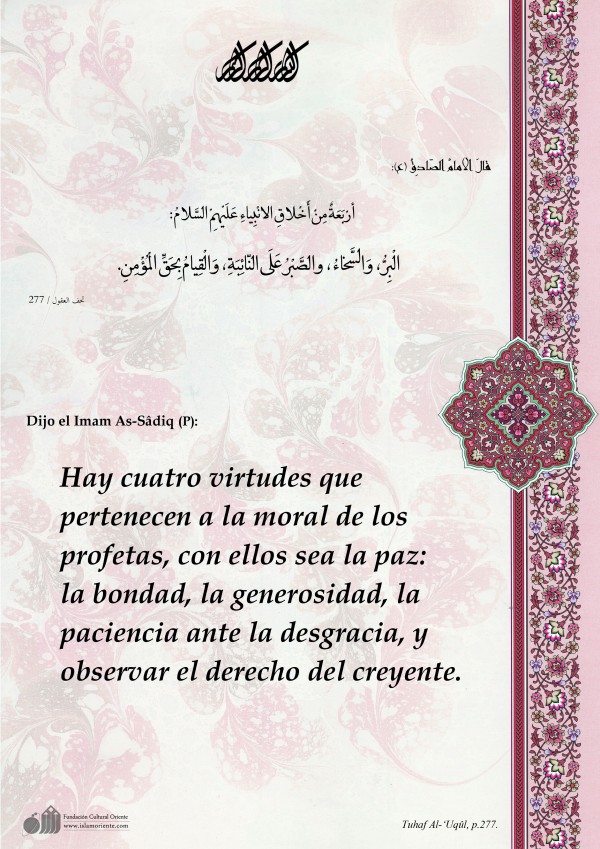 Dijo el Imam As-Sâdiq (P): Hay cuatro virtudes que pertenecen a la moral de los profetas, con ellos sea la paz: la bondad, la generosidad, la paciencia ante la desgracia, y observar el derecho del creyente.