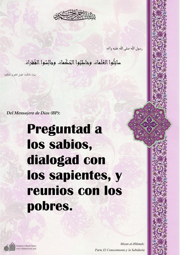 Del Mensajero de Dios (BP): Preguntad a los sabios, dialogad con los sapientes, y reunios con los pobres.[I]