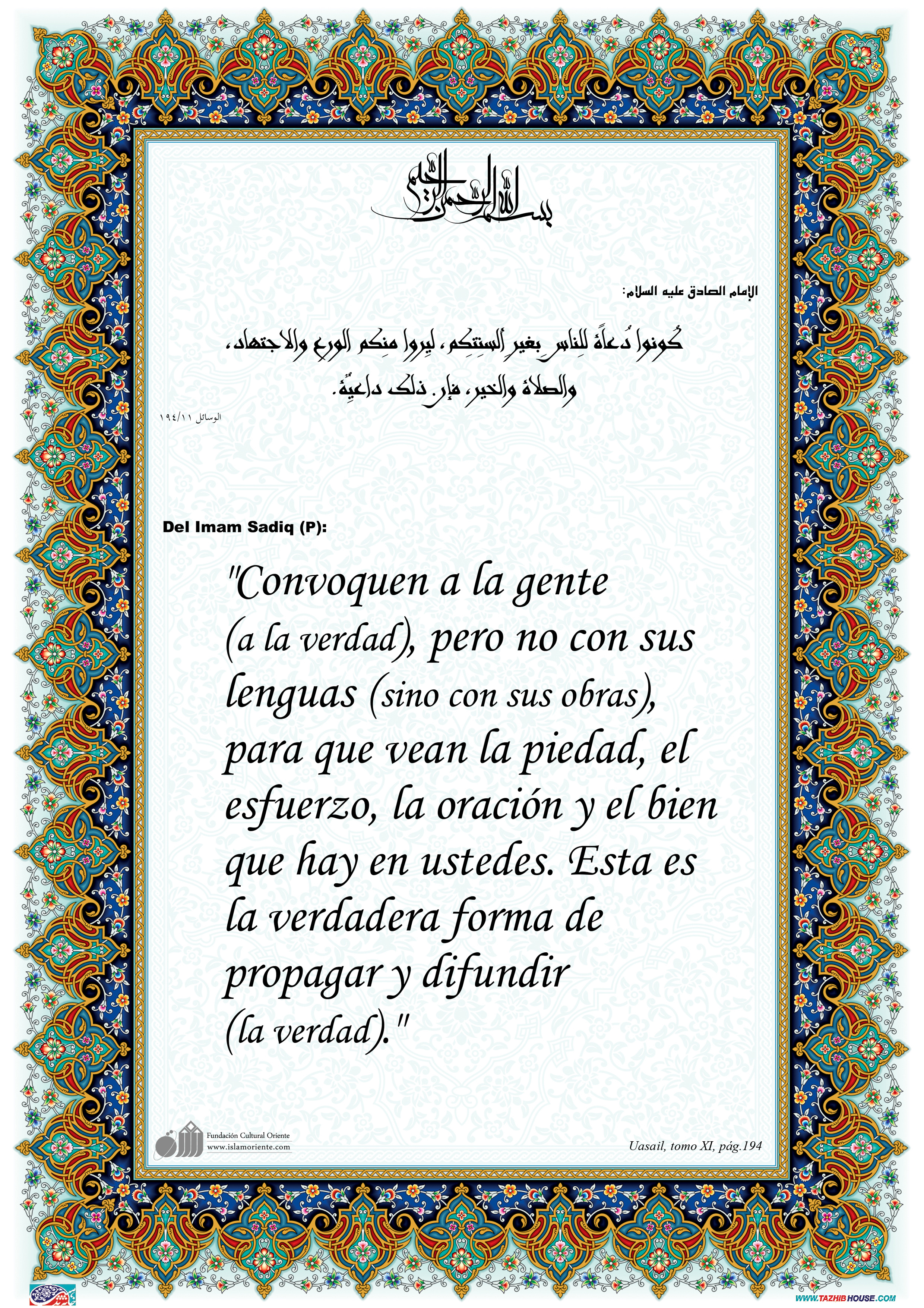 Del Imam Sadiq (P): "Convoquen a la gente (a la verdad), pero no con sus lenguas (sino con sus obras), para que vean la piedad, el esfuerzo, la oración y el bien que hay en ustedes. Esta es la verdadera forma de propagar y difundir (la verdad)."