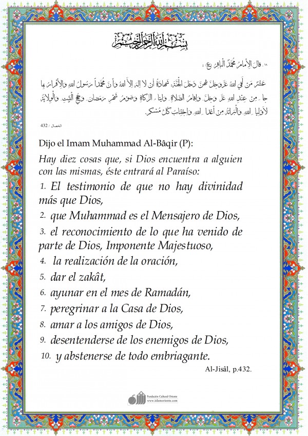 قالَ الإمامُ مُحَمَّدٌ الْباقِرُ (علیه السّلام): عَشْرٌ مَنْ لَقِيَ اللهُ عَزَّوَجَلَّ بهنَّ دَخَلَ الْجَنَّةَ: شَهادَةُ أنْ لا اِلهَ اِلاَّ اللهُ وَأَ نَّ مُحَمَّداً رَسُولُ اللهِ وَالإقْرارُ بِما جاءَ مِنْ عِنْدِ اللهِ عَزَّ وَجَلَّ، وَاِقامُ الصَّلاةِ، وَايتاءُ الزَّكاةِ وَصَوْمُ شَهْرِ رَمَضانَ، وَحِجُّ الْبَيْتِ، وَالْوِلايَةُ لاَوْلِياءِ اللهِ، وَالْبَرائَةُ مِنْ أَعْداءِ اللهِ وَاِجْتِنابُ كُلِّ مُسْكِر