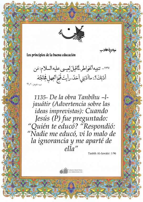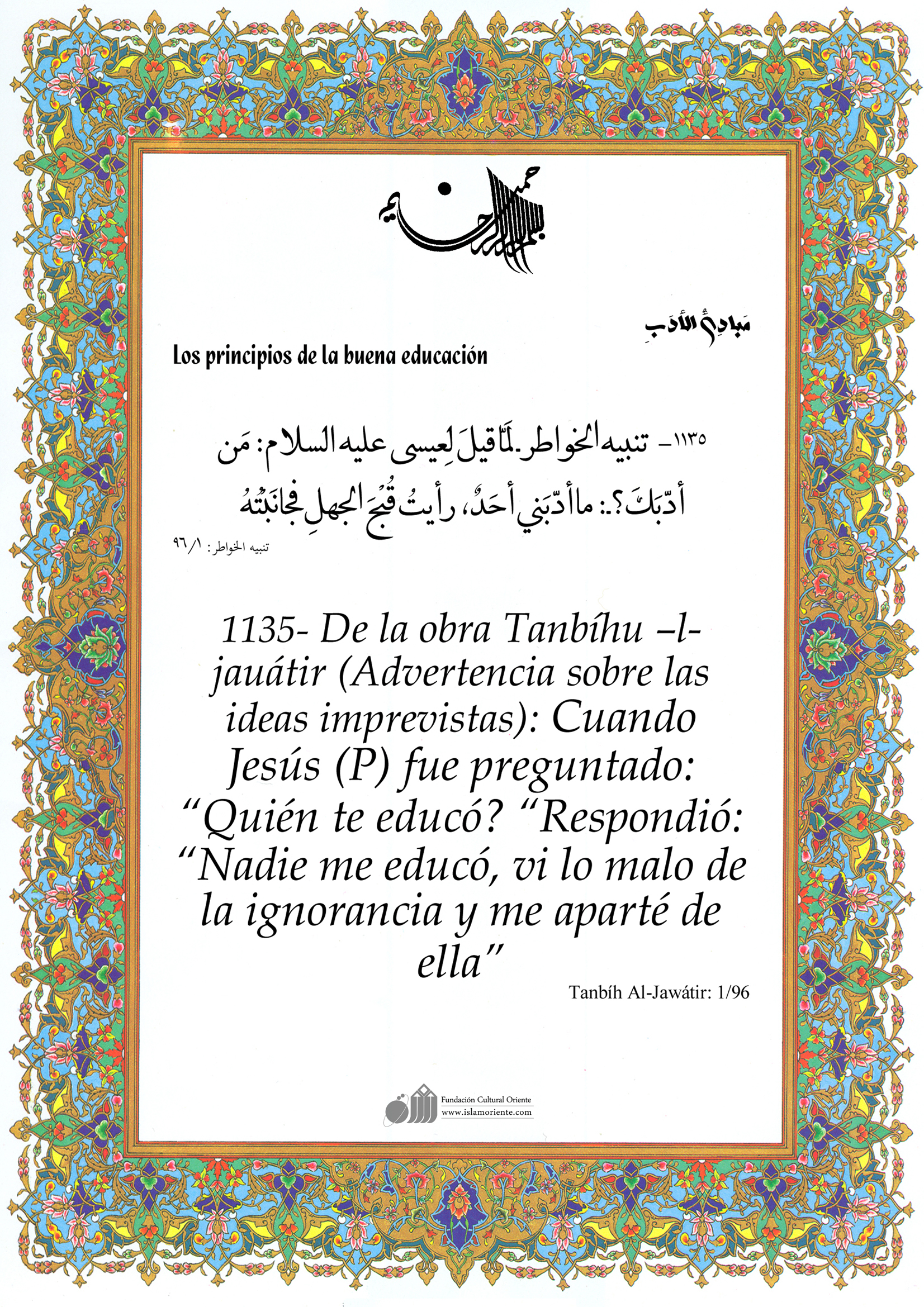 De la obra Tanbíhu –l-jauátir (Advertencia sobre las ideas imprevistas): Cuando Jesús (P) fue preguntado: “Quién te educó?” Respondió: “Nadie me educó, vi lo malo de la ignorancia y me aparté de ella”