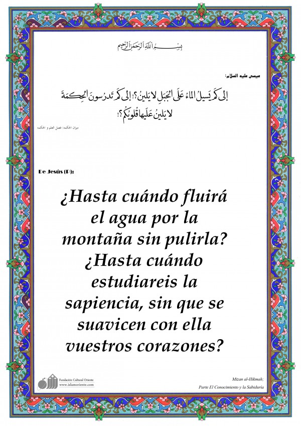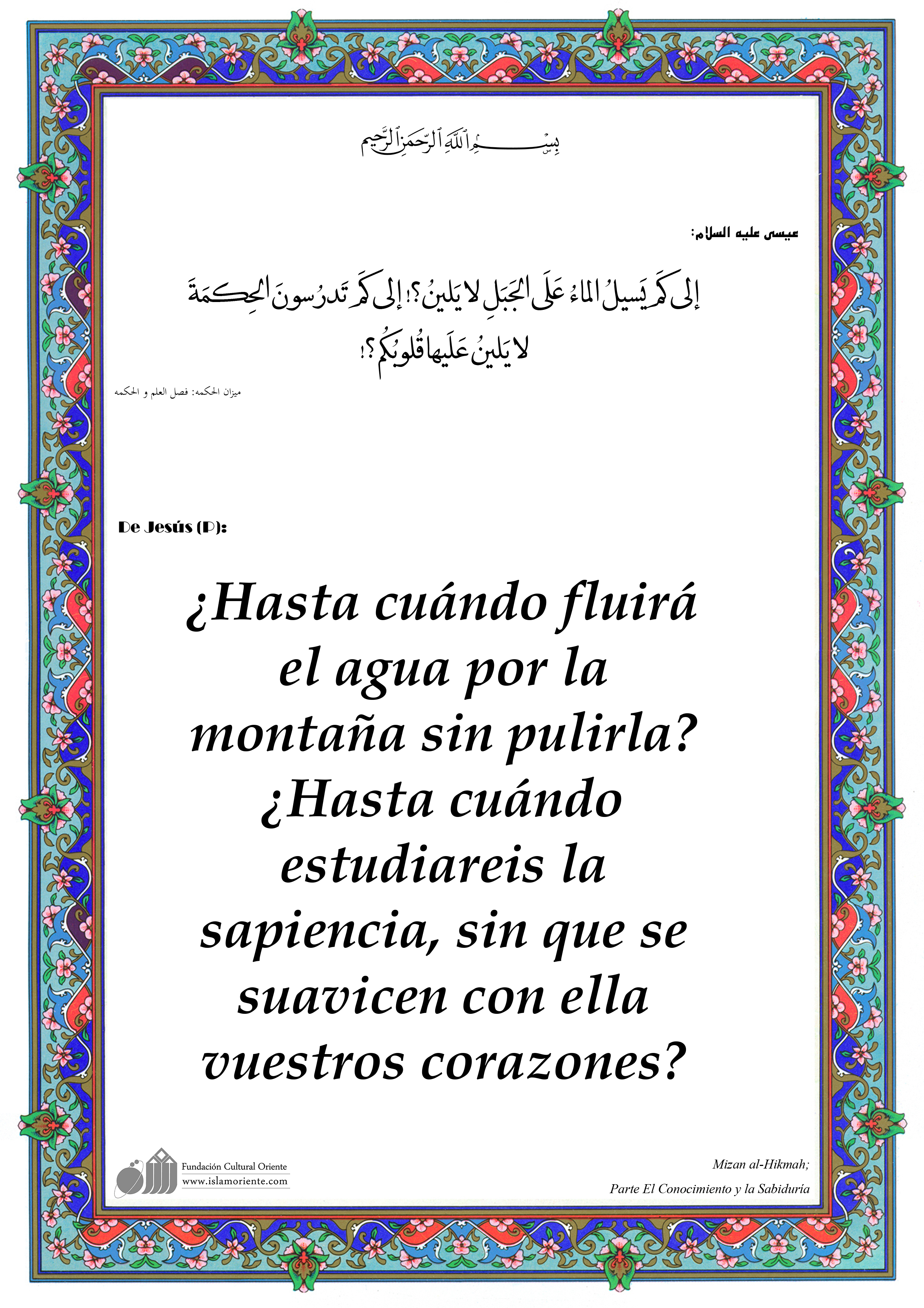 De Jesús (P): ¿Hasta cuándo fluirá el agua por la montaña sin pulirla? ¿Hasta cuándo estudiareis la sapiencia, sin que se suavicen con ella vuestros corazones?[I]