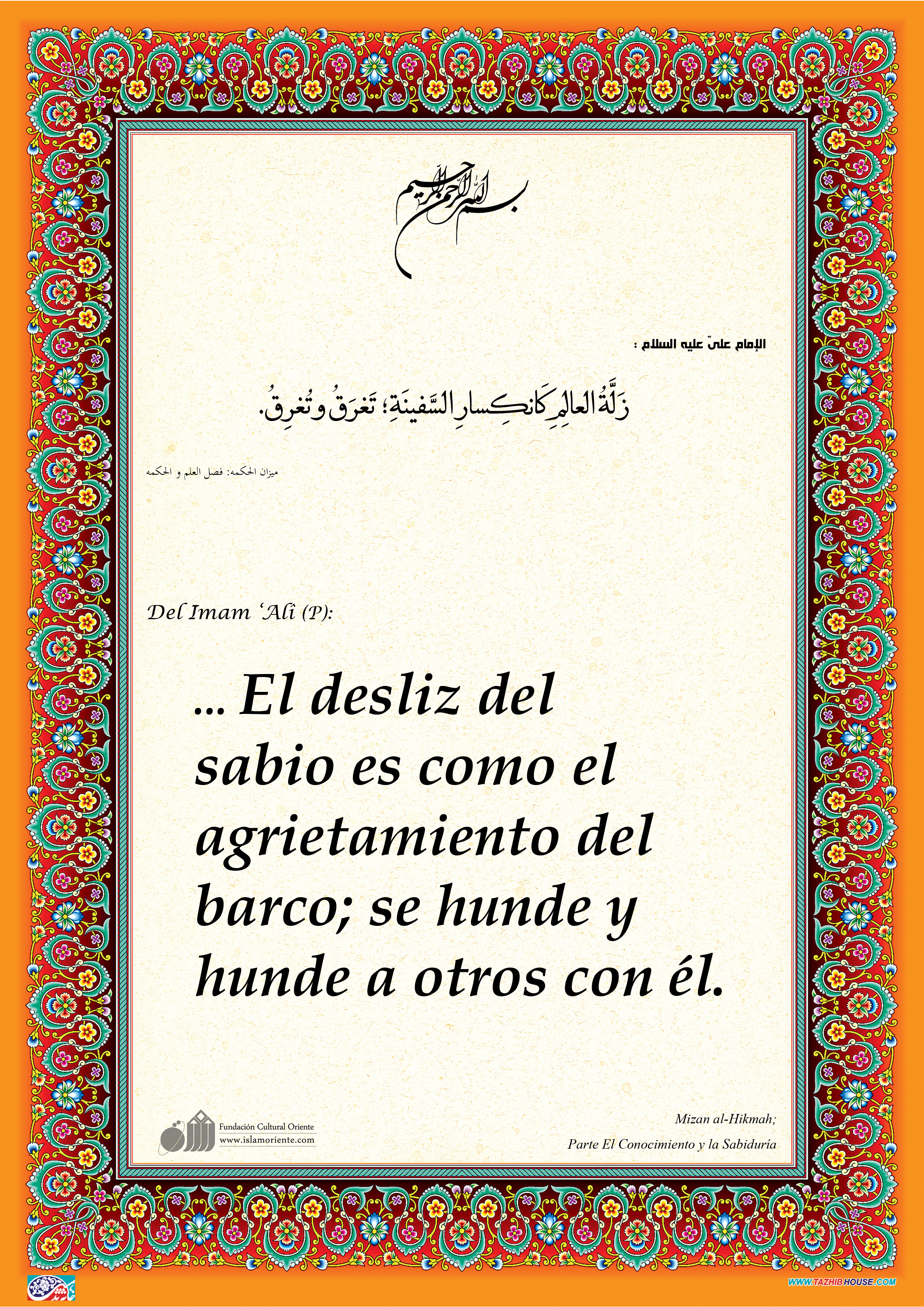 Del Imam ‘Alî (P): ... El desliz del sabio es como el agrietamiento del barco; se hunde y hunde a otros con él.[I]