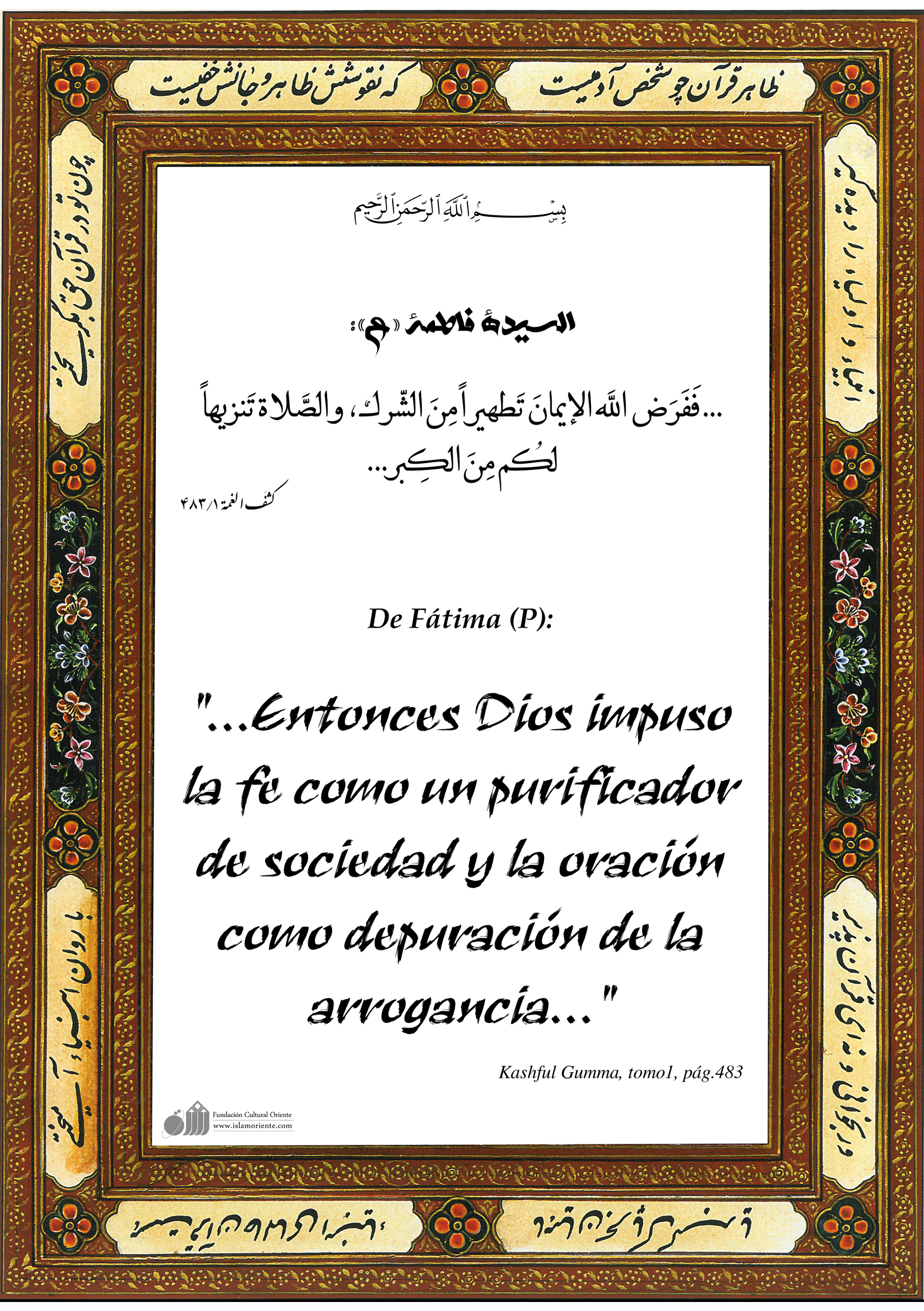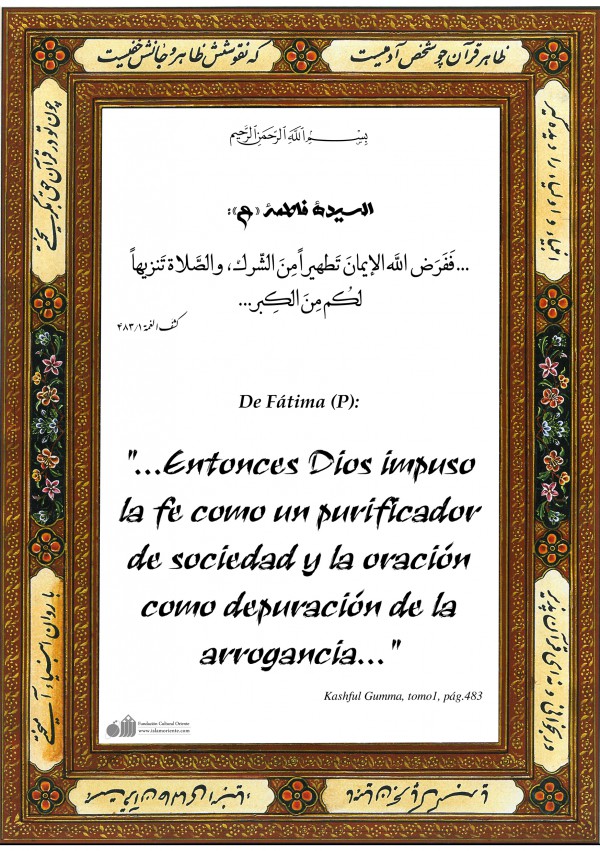 السيدة فاطمة «ع»: ... فَفَرَض اللَّه الإيمانَ تَطهيراً مِنَ الشّرك، والصَّلاة تَنزيهاً لكُم مِنَ الكِبر...