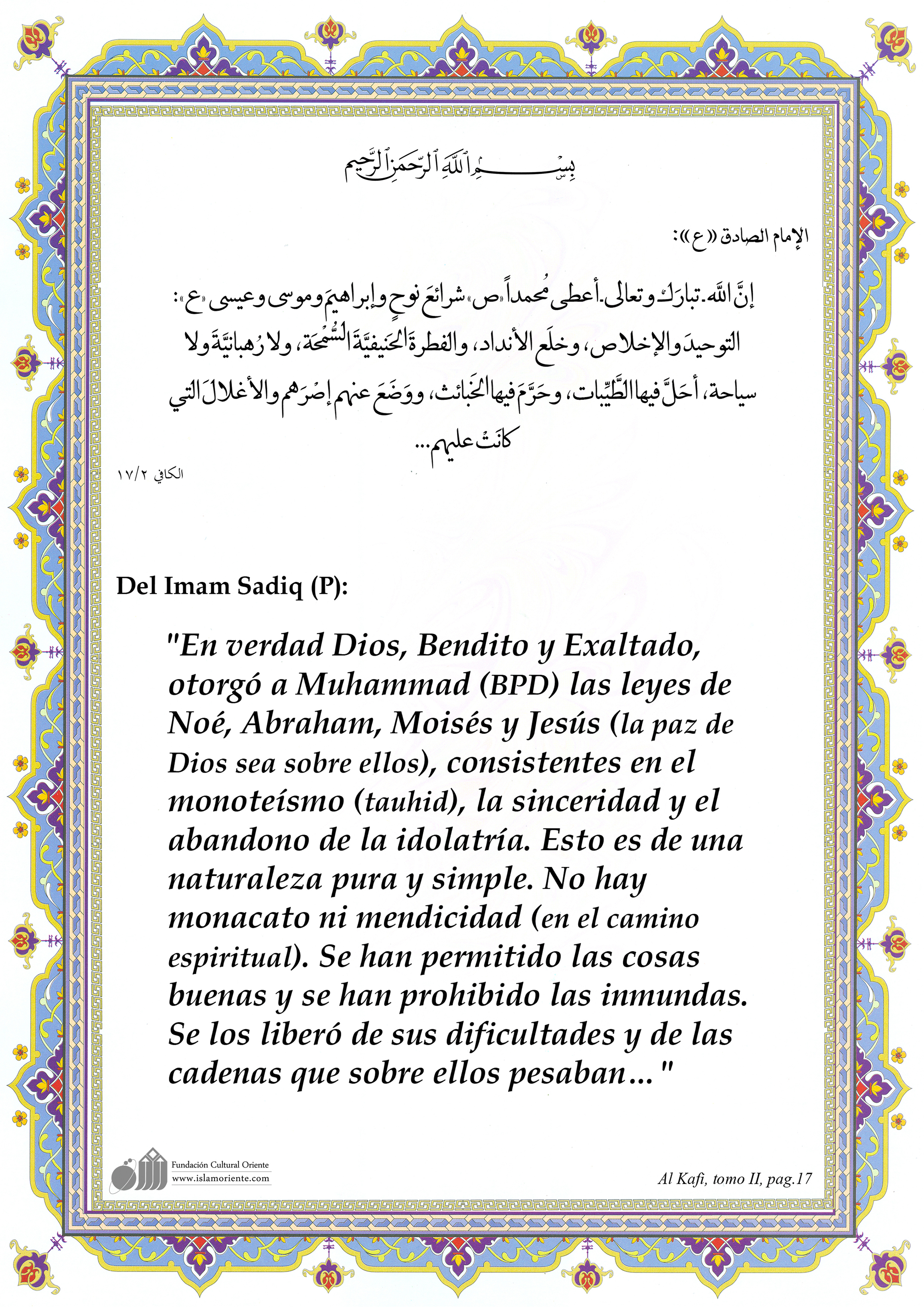 Del Imam Sadiq (P): "En verdad Dios, Bendito y Exaltado, otorgó a Muhammad (BPD) las leyes de Noé, Abraham, Moisés y Jesús (la paz de Dios sea sobre ellos), consistentes en el monoteísmo (tauhid), la sinceridad y el abandono de la idolatría. Esto es de una naturaleza pura y simple. No hay monacato ni mendicidad (en el camino espiritual). Se han permitido las cosas buenas y se han prohibido las inmundas. Se los liberó de sus dificultades y de las cadenas que sobre ellos pesaban…"