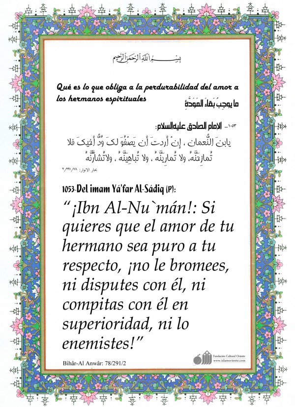 Del imam Yá'far Al-Sádiq (P): “¡Ibn Al-Nu`mán!: Si quieres que el amor de tu hermano sea puro a tu respecto, ¡no le bromees, ni disputes con él, ni compitas con él en superioridad, ni lo enemistes!”