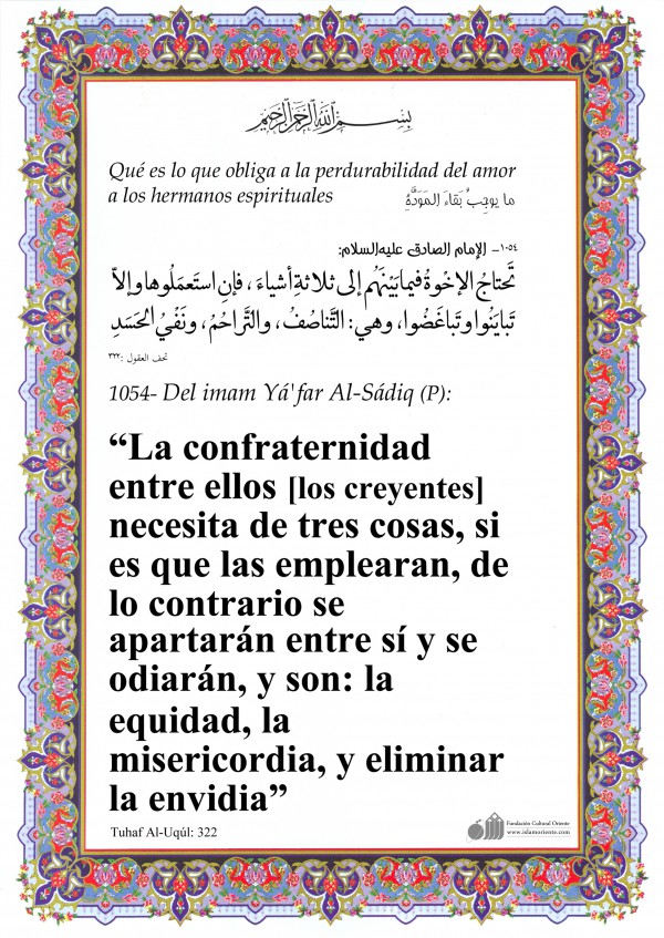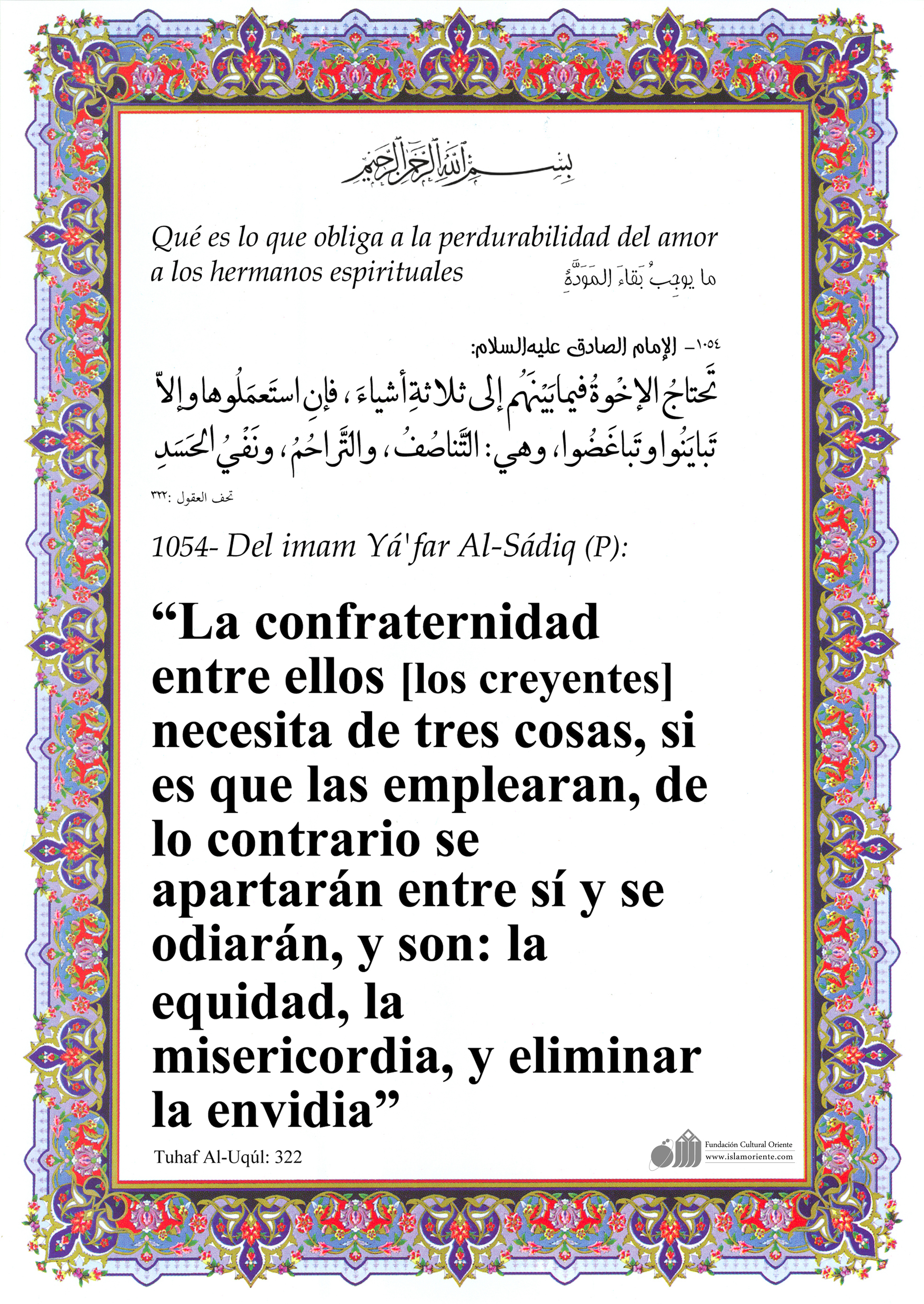 Del imam Yá'far Al-Sádiq (P): “La confraternidad entre ellos [los creyentes] necesita de tres cosas, si es que las emplearan, de lo contrario se apartarán entre sí y se odiarán, y son: la equidad, la misericordia, y eliminar la envidia”