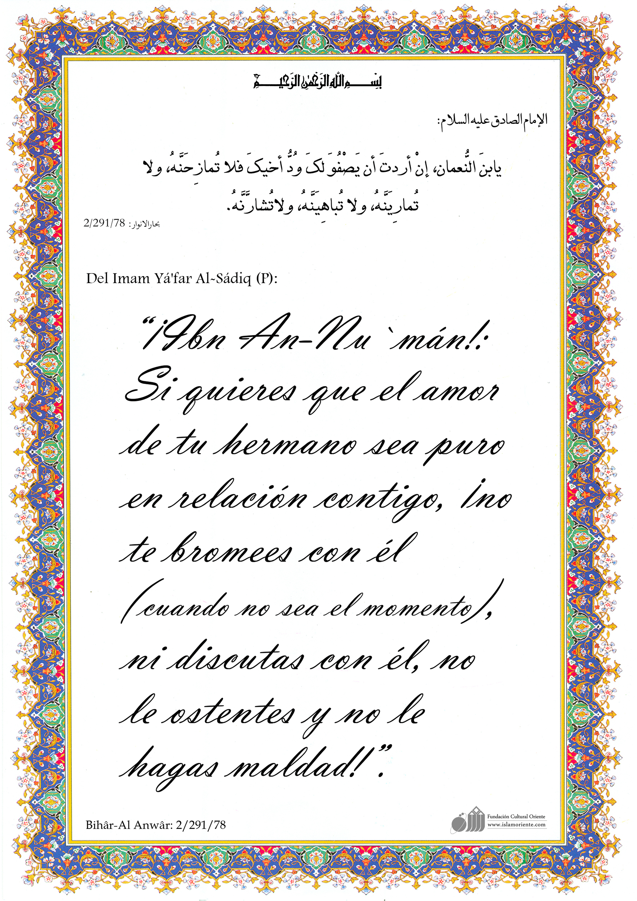 Del Imam Yá'far Al-Sádiq (P): “¡Ibn An-Nu`mán!: Si quieres que el amor de tu hermano sea puro en relación contigo, ¡no te bromees con él (cuando no sea el momento), ni discutas con él, no le ostentes y no le hagas maldad!”.