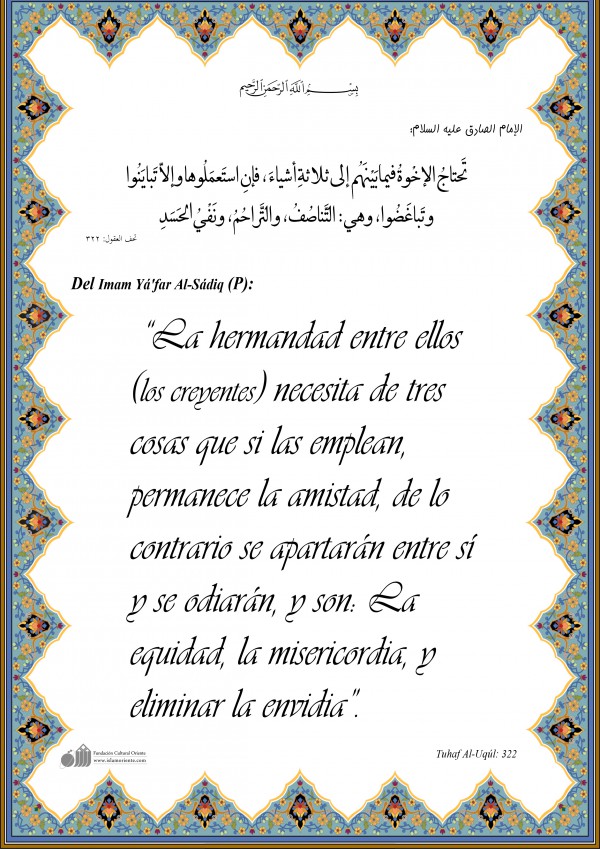 Del Imam Yá'far Al-Sádiq (P): “La hermandad entre ellos (los creyentes) necesita de tres cosas que si las emplean, permanece la amistad, de lo contrario se apartarán entre sí y se odiarán, y son: La equidad, la misericordia, y eliminar la envidia”.