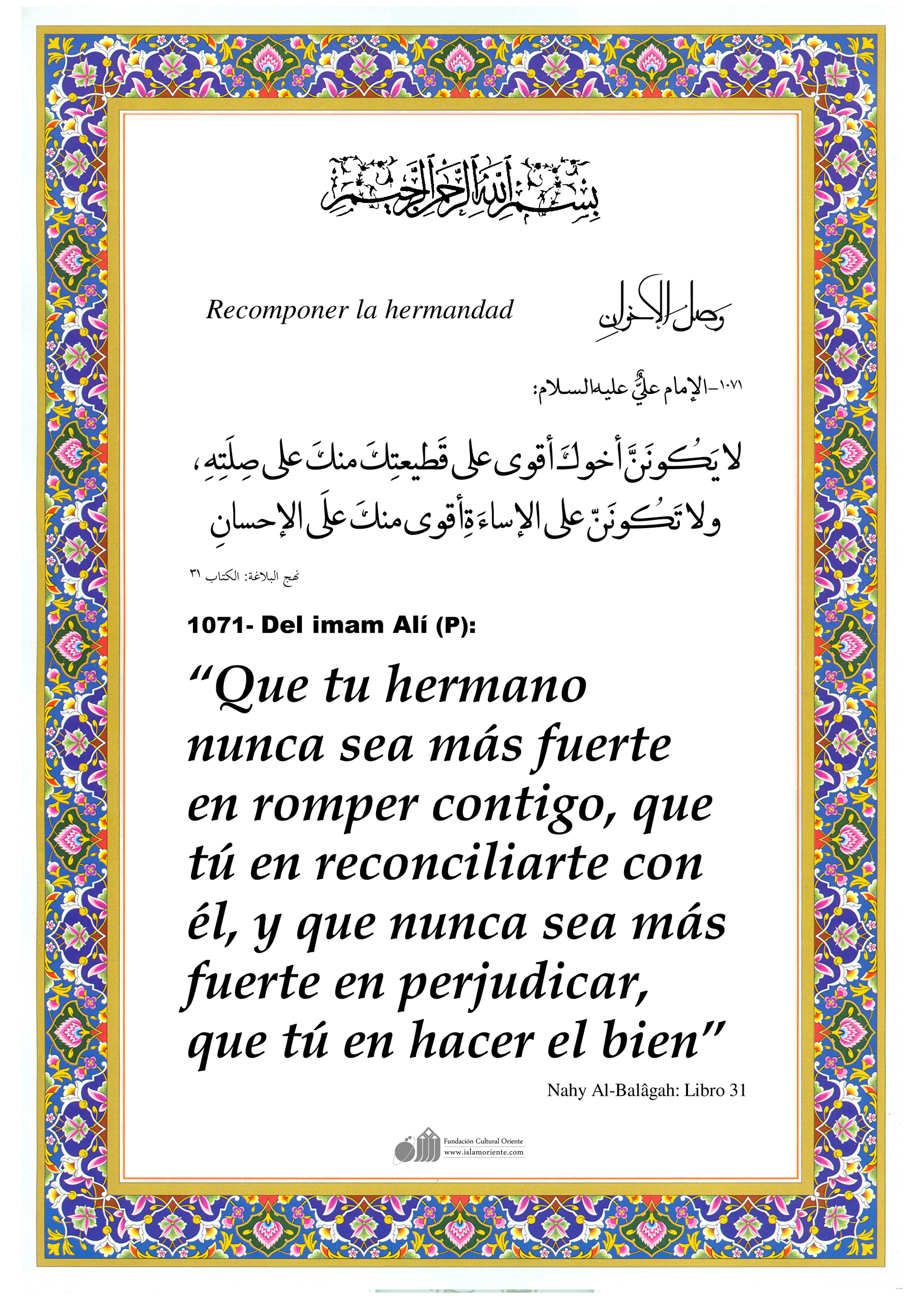 Del imam Alí (P): “Que tu hermano nunca sea más fuerte en romper contigo, que tú en reconciliarte con él, y que nunca sea más fuerte en perjudicar, que tú en hacer el bien”