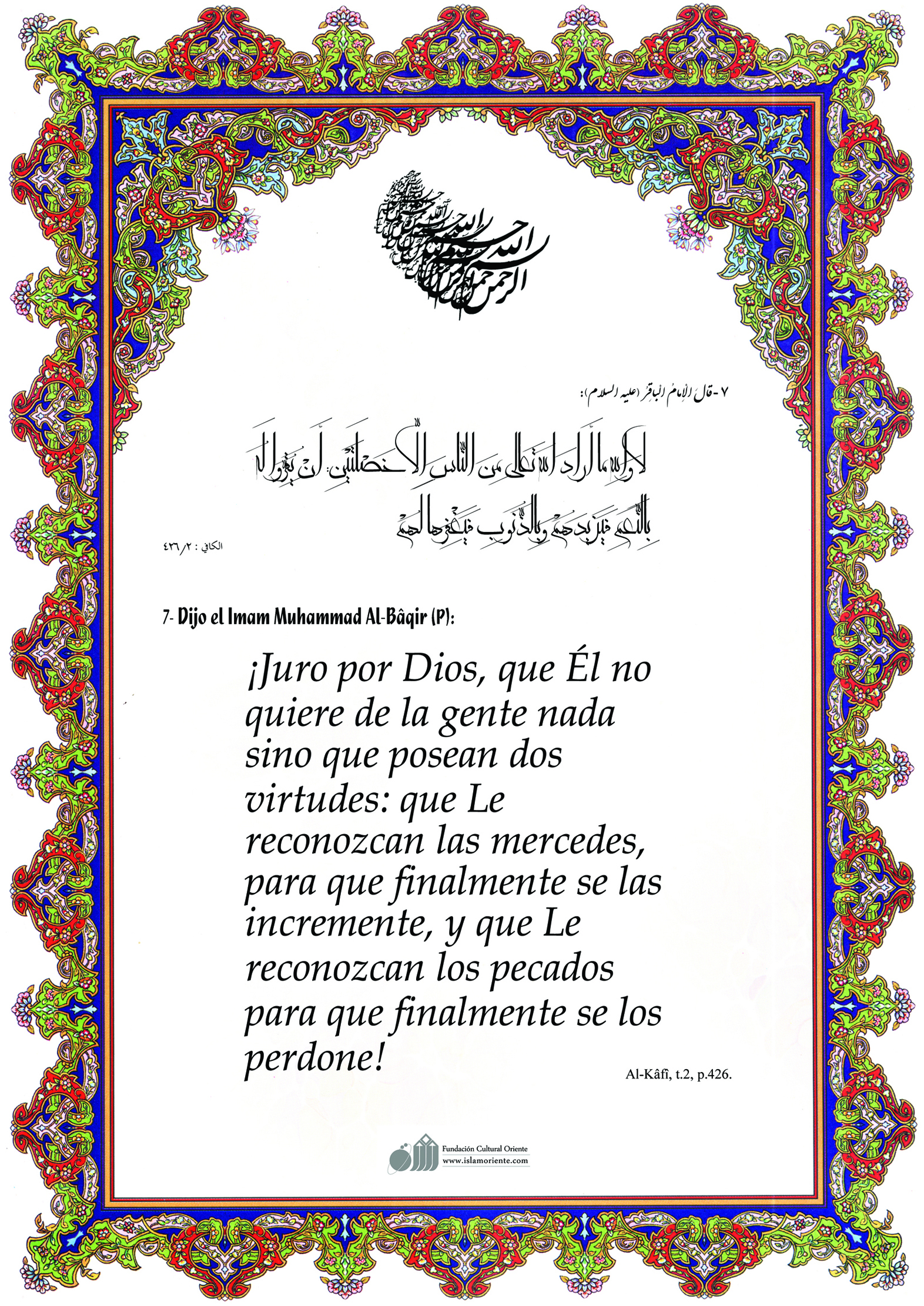 Dijo el Imam Muhammad Al-Bâqir (P): ¡Juro por Dios, que Él no quiere de la gente nada sino que posean dos virtudes: que Le reconozcan las mercedes, para que finalmente se las incremente, y que Le reconozcan los pecados para que finalmente se los perdone!