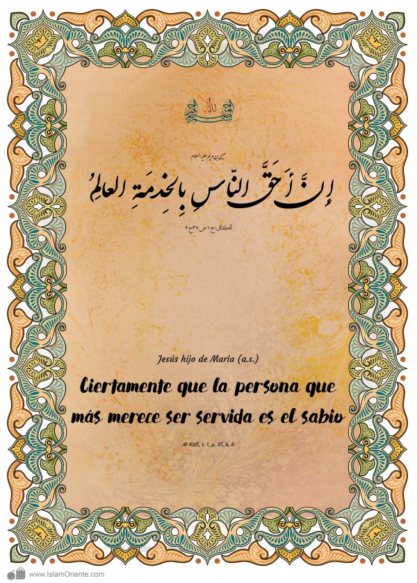 Al-Kâfî, transmitido por Muhammad ibn Sinân en un hadîz marfu‘ (de cadena de transmisión inconclusa): Dijo Jesús hijo de María (a.s.): … Ciertamente que la persona que más merece ser servida es el sabio.[2]