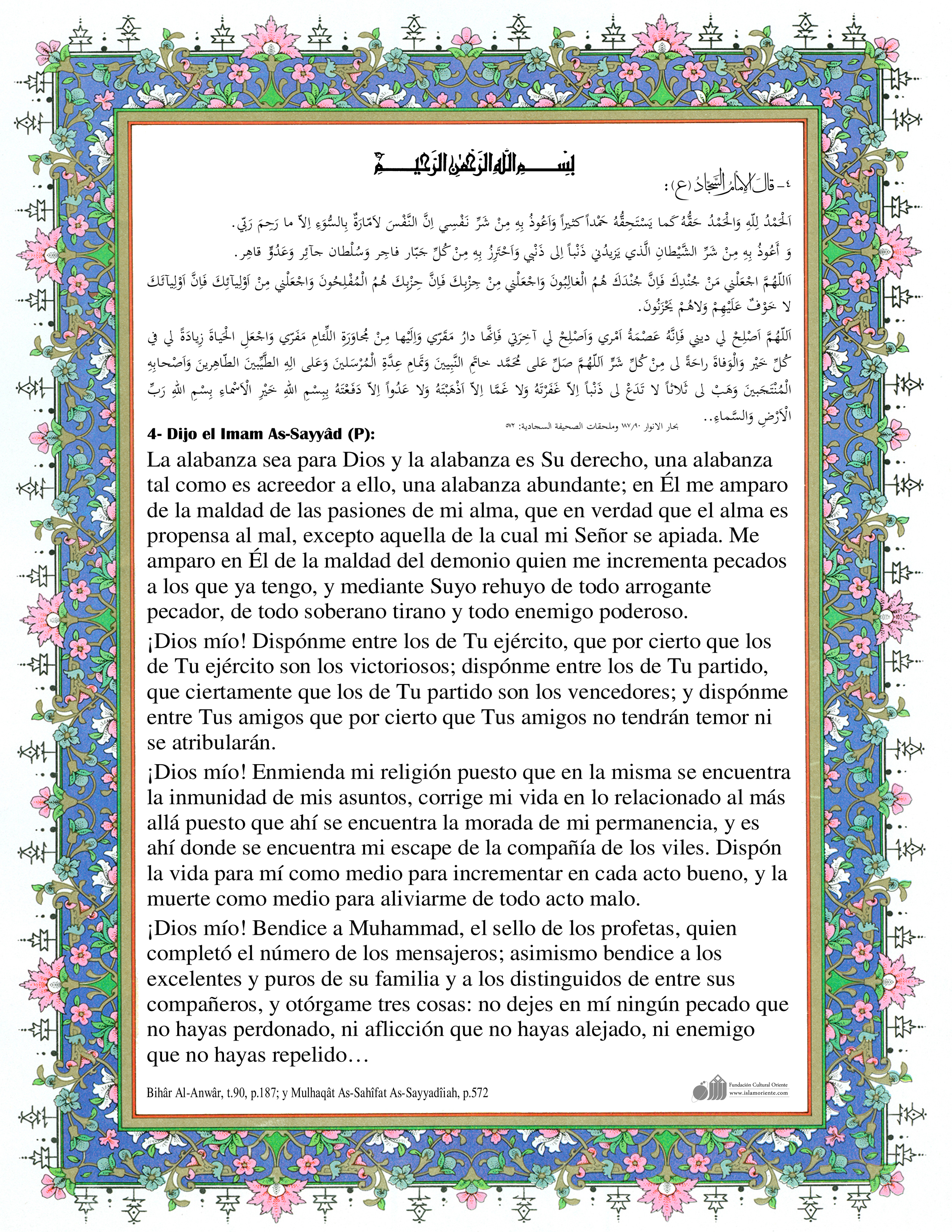 Dijo el Imam As-Sayyâd (P): La alabanza sea para Dios y la alabanza es Su derecho, una alabanza tal como es acreedor a ello, una alabanza abundante; en Él me amparo de la maldad de las pasiones de mi alma, que en verdad que el alma es propensa al mal, excepto aquella de la cual mi Señor se apiada. Me amparo en Él de la maldad del demonio quien me incrementa pecados a los que ya tengo, y mediante Suyo rehuyo de todo arrogante pecador, de todo soberano tirano y todo enemigo poderoso. ¡Dios mío! Dispónme entre los de Tu ejército, que por cierto que los de Tu ejército son los victoriosos; dispónme entre los de Tu partido, que ciertamente que los de Tu partido son los vencedores; y dispónme entre Tus amigos que por cierto que Tus amigos no tendrán temor ni se atribularán. ¡Dios mío! Enmienda mi religión puesto que en la misma se encuentra la inmunidad de mis asuntos, corrige mi vida en lo relacionado al más allá puesto que ahí se encuentra la morada de mi permanencia, y es ahí donde se encuentra mi escape de la compañía de los viles. Dispón la vida para mí como medio para incrementar en cada acto bueno, y la muerte como medio para aliviarme de todo acto malo. ¡Dios mío! Bendice a Muhammad, el sello de los profetas, quien completó el número de los mensajeros; asimismo bendice a los excelentes y puros de su familia y a los distinguidos de entre sus compañeros, y otórgame tres cosas: no dejes en mí ningún pecado que no hayas perdonado, ni aflicción que no hayas alejado, ni enemigo que no hayas repelido…