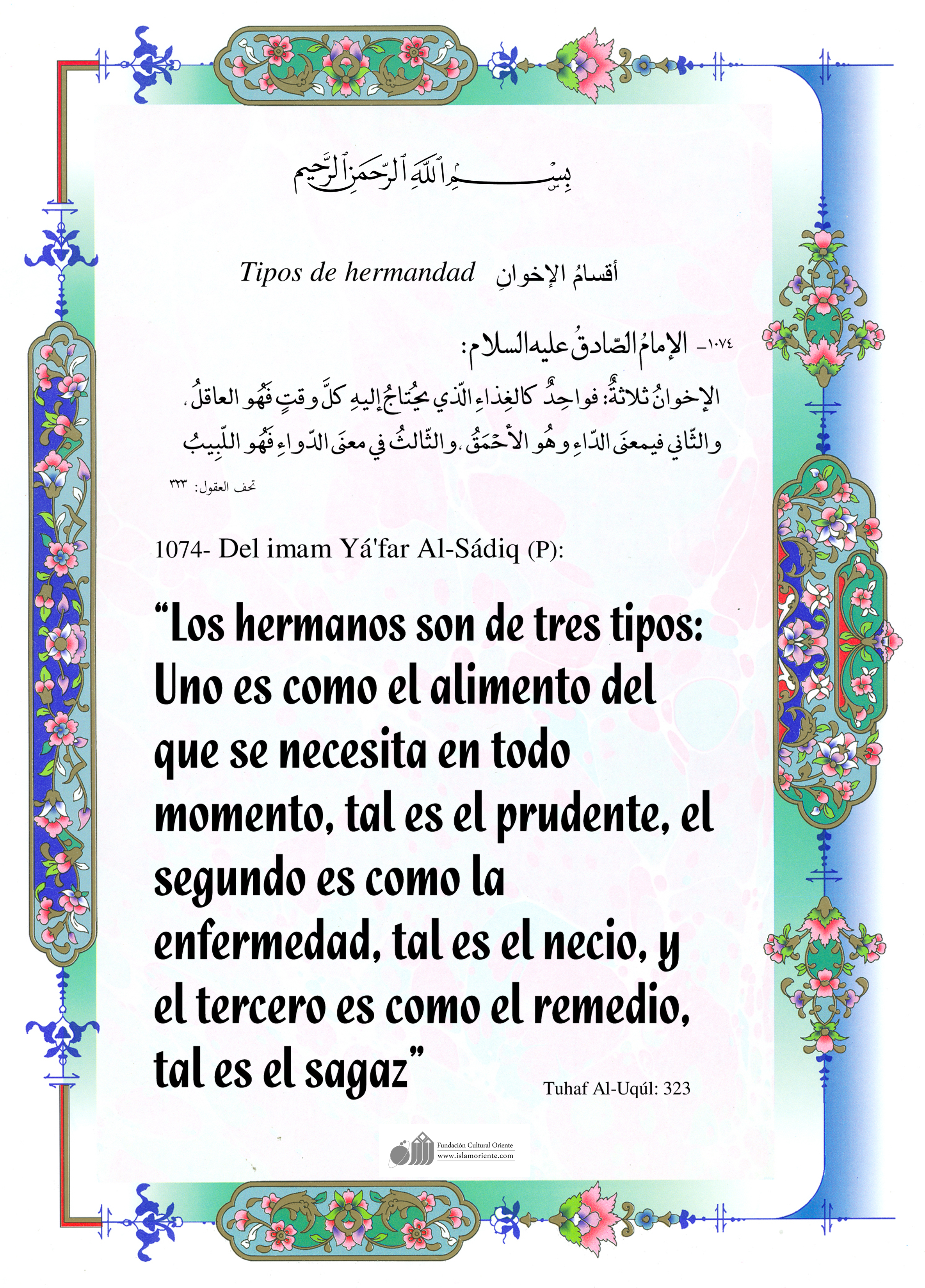 Del imam Yá'far Al-Sádiq (P): “Los hermanos son de tres tipos: Uno es como el alimento del que se necesita en todo momento, tal es el prudente, el segundo es como la enfermedad, tal es el necio, y el tercero es como el remedio, tal es el sagaz”